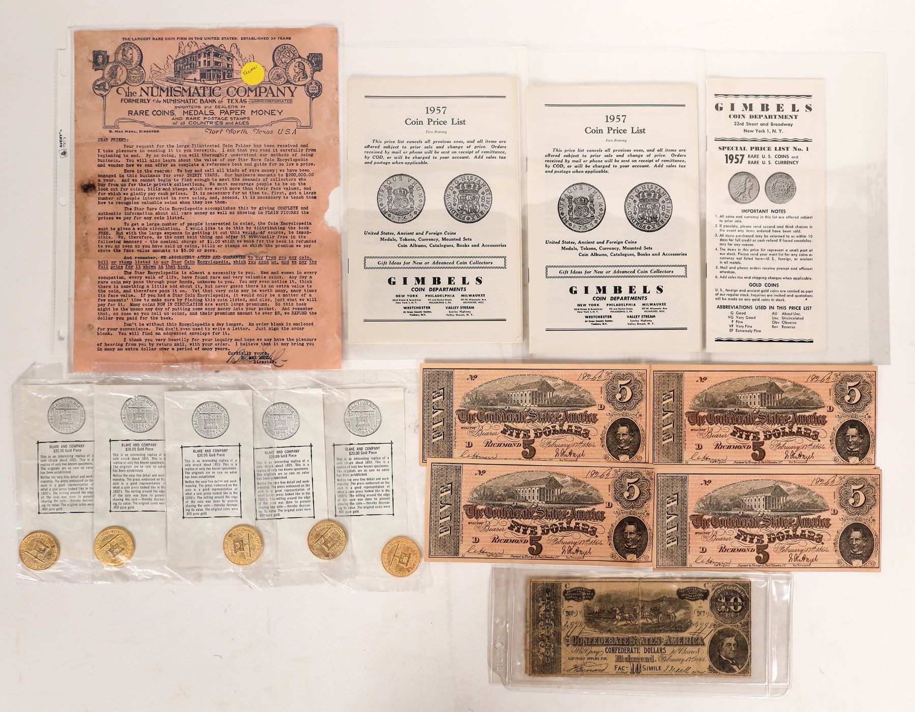 3x 1957 Gimbels coin price lists. 5x facsimile Confederate currency, $5 and $10. 5x replica $20 1855 Sacramento gold piece.