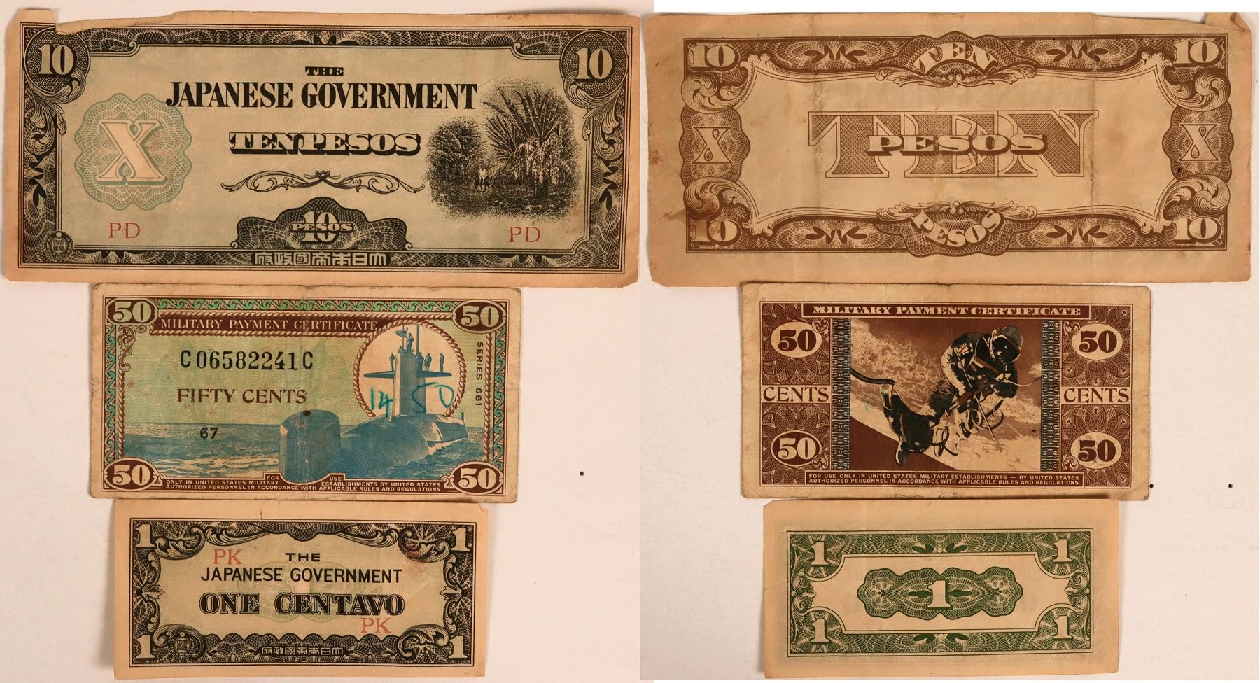 Lot of three numismatics scrip, used during the '40s through the '70s. Includes a Military Payment Certificate (MPC) for 50 cents, series 681, with submarine on front and astronaut on reverse. MPC's were issued from 1946 until 1973. They were printed in fifteen series and used by the U.S. Military in 22 different countries. Also includes two Japanese Government scrip, for ten pesos and one centavo. The Japanese Government issued these during WWII, to replace Philippine money, coins and U.S. currency, after capturing the Philippines Islands in late 1940. See photo for more details.