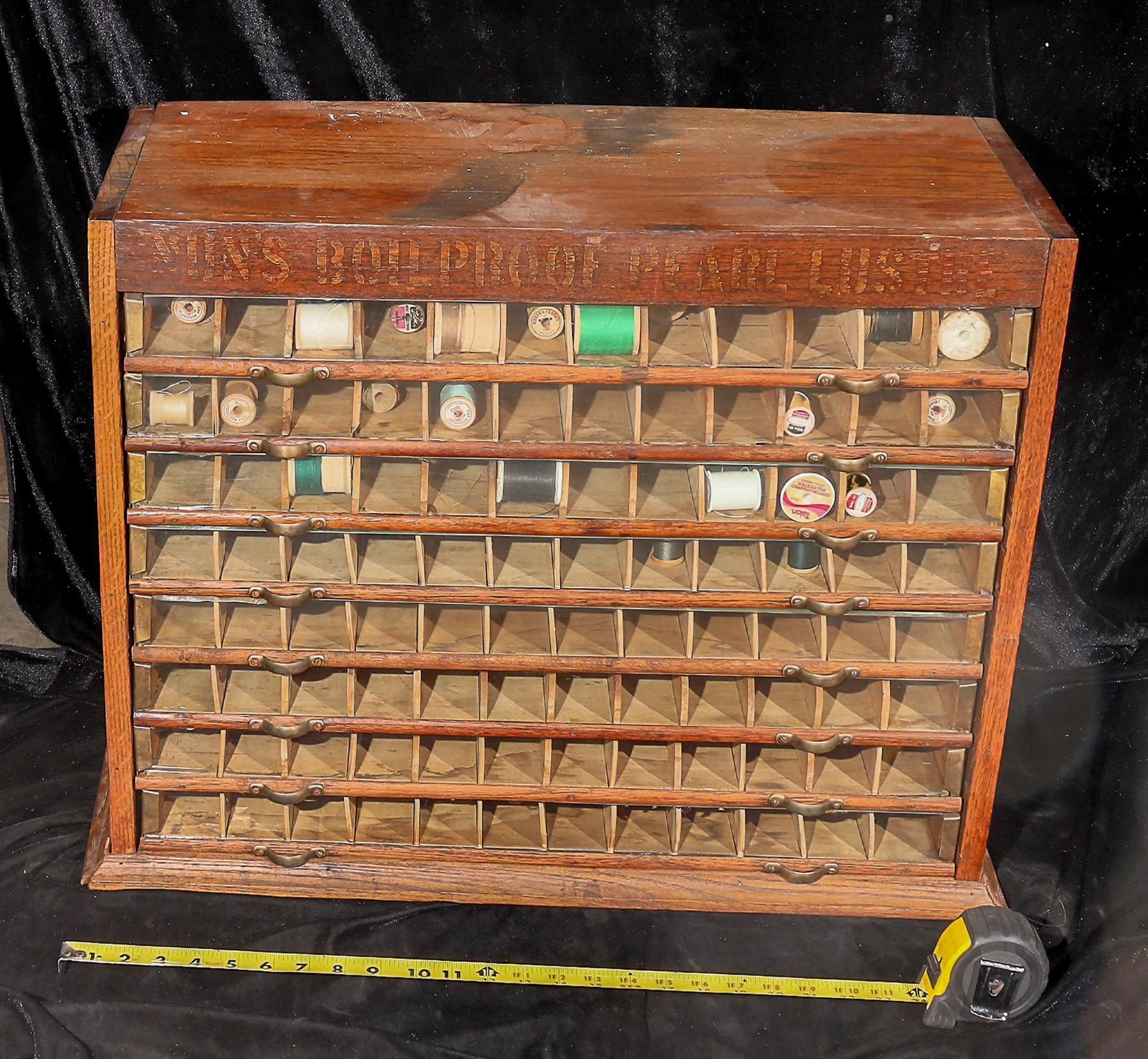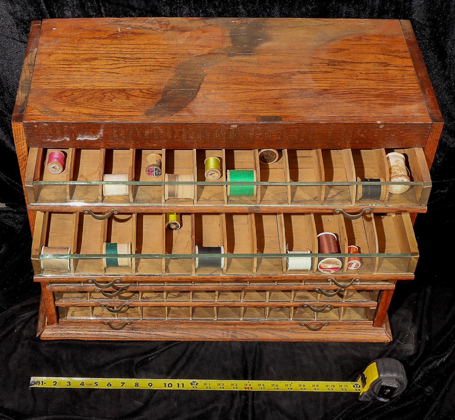Display cabinet for Nun's Spool Thread with the original decal on front // Nun's Boil Proof Pearl Luster // on reversed in large letters // Nun's / Registered / All Boiler Proof Shades / Pearl Luster / the Thread / With a Guarantee / For / Quality Color Luster //. The front has eight row drawers with glass fronts. Spools contained inside are not original. Made of straight-grained, quartersawn oak with concave base trim. The left side needs to be reattached. Likely English. 12 x 26 x 21 inches, c1880s-1890. Gary Bracken Collection