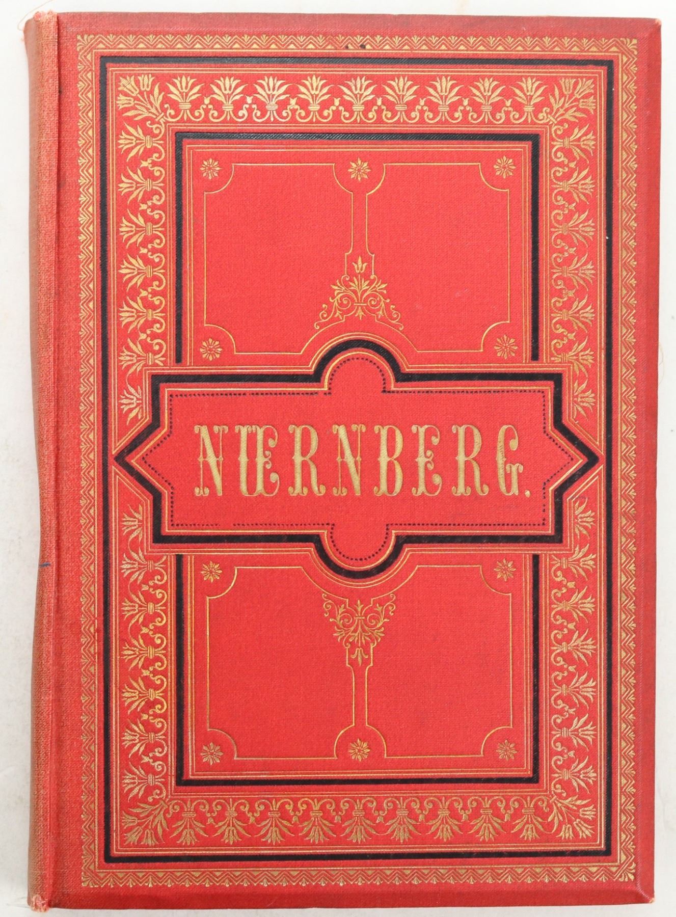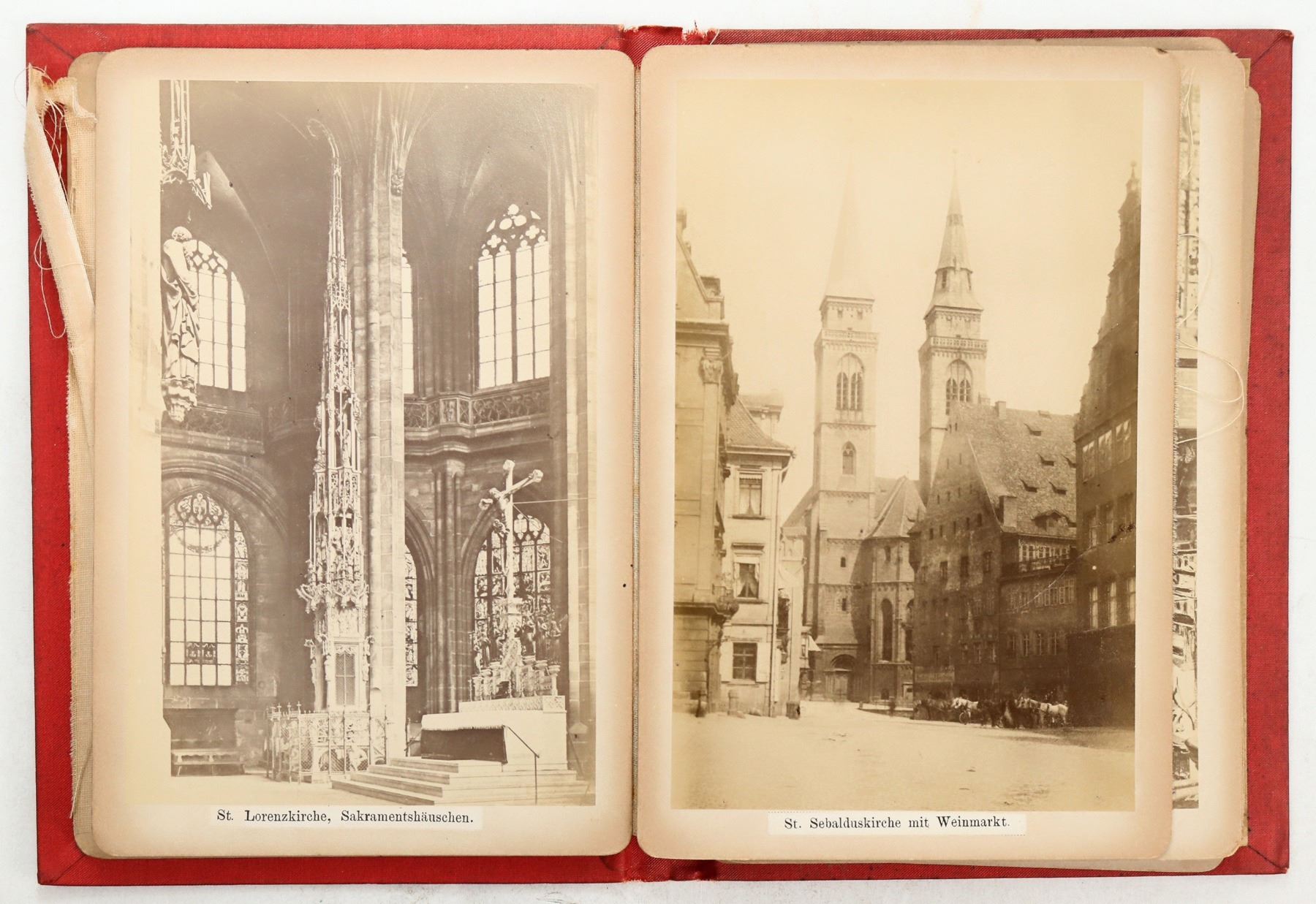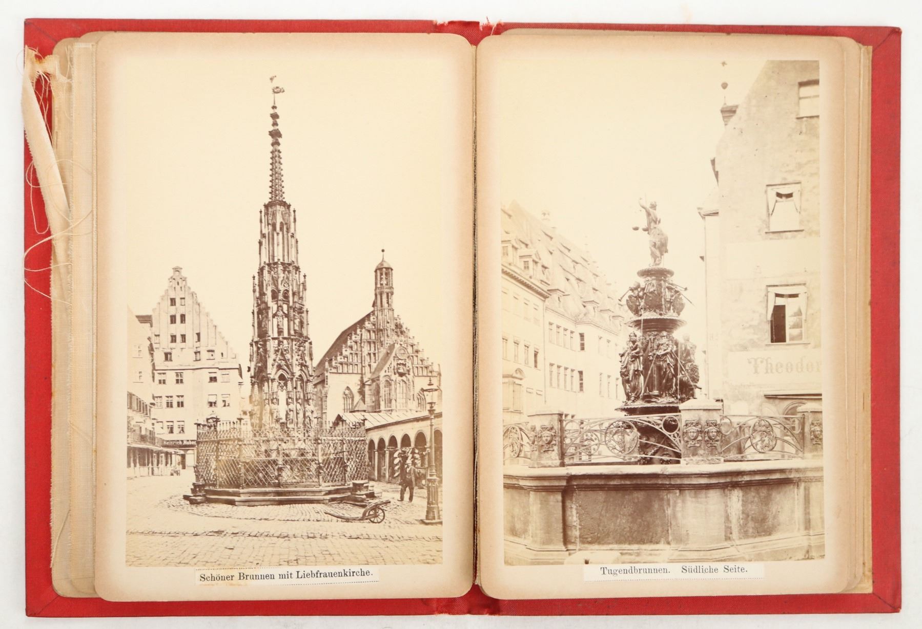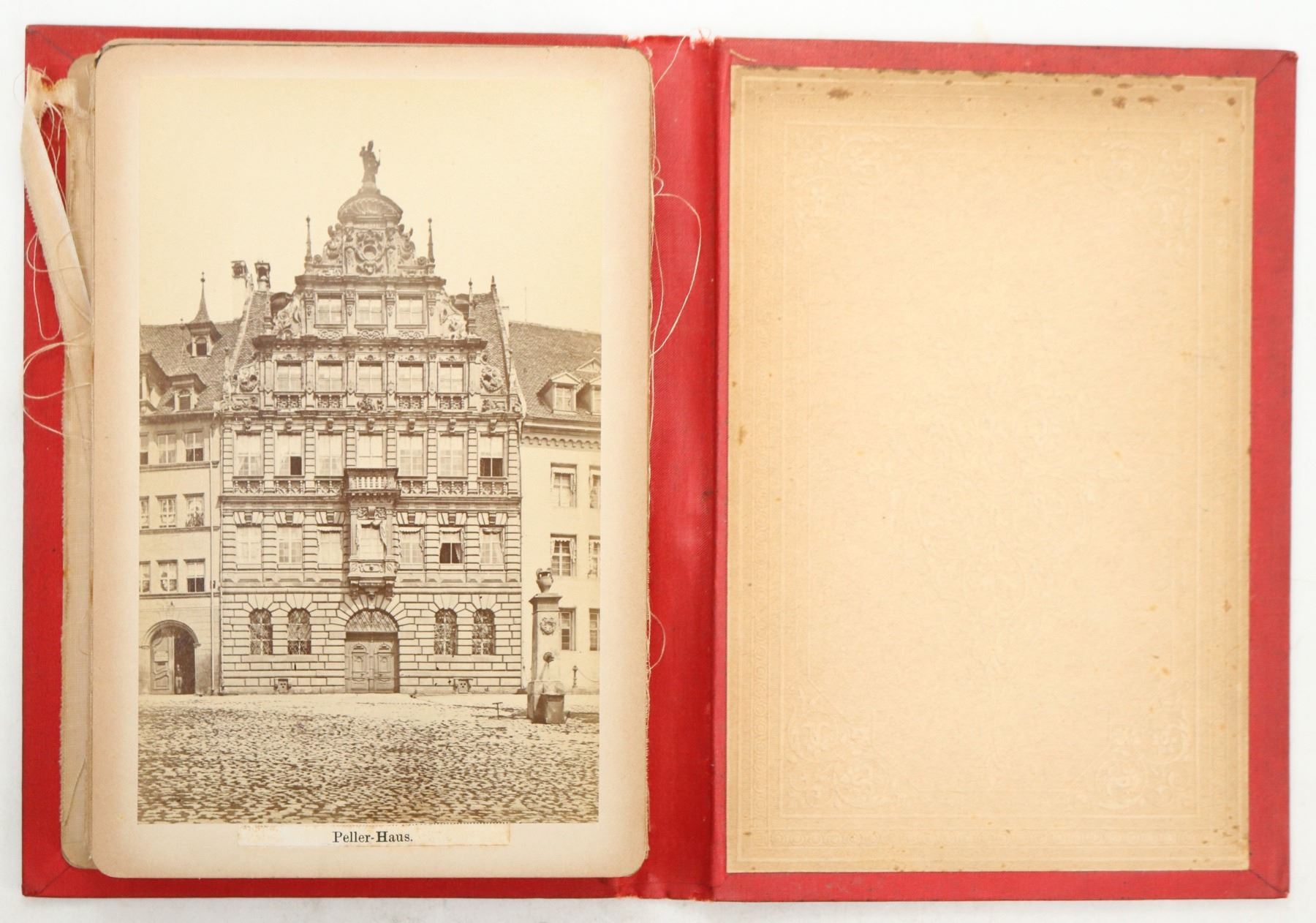 Red bound volume (5 x 7 inches) with twelve black and white photos of historic sites of Nuremberg, circa 1890. Albrecht Durer's statue, houses, views of the city. The binding of the photos has come undone, but is repairable.