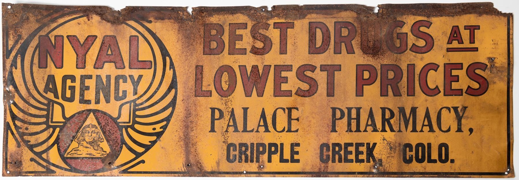 Yellow, red and black sign with Sphinx, Nyal's Family Remedies, Palace Pharmacy, Cripple Creek, Colo. 10x27.75". About 16 small holes and moderate rust. Right top corner missing. Please inspect.