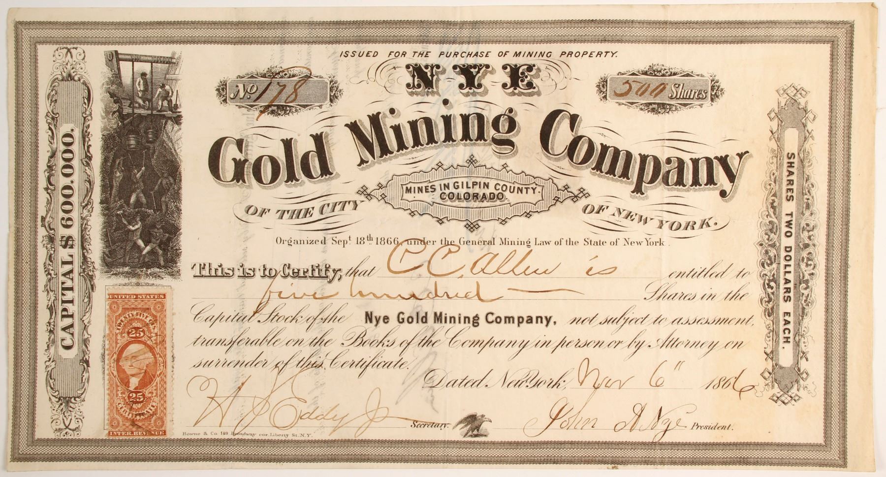 We have seen this stock certificate once before and were unsure of its place in history. That has not changed! #178 for 500 shares to CC Allen. Datelined New York 1866. Signed by president John Nye and secretary H eddy Jr. 25c Certificate Revenue stamp. 5c and 20c small stamps on back. Vignette of miners underground hoisting up ore by bucket. Organized September 13, 1866. "Mines in Gilpin County, Colorado." Bowne & Co. printer. Not Cancelled. Pin holes and light staining. Nye Gold Mining Company is not listed in Wallihan (1871), nor in Corbett (1879), nor in Hollister (1867). Nye has an advertisement in Hollister opposite the fold-out map. John A. Nye ran the Nye Forwarding agency in New York and Loyal S. Nye ran it is Denver. Goes to all points in Colorado Montana, Idaho, Utah and New Mexico. Prag Collection.