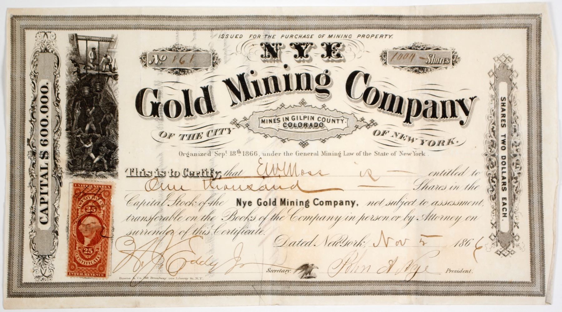 Nye Gold Mining Company of the City of New York, Mines in Gilpin County, Colorado, one thousand shares of capital shares issued to E.W. Moss, dated Nov 5, 1866, and signed by John A. Nye. Mr. Nye is listed as the president of an unnamed company in the 1866 Directory of New York, then as a merchant in the 1867 edition, and not listed in the 1868 edition. Nye Gold Mining Company is not listed in Wallihan (1871), nor in Corbett (1879), nor in Hollister (1867). Certificate includes a vertical vignette of a mining shaft with miners on three levels. The Online Archive of California lists a John A. Nye (1832-1906) from Unadilla, NY. Date: 1866 Location: Gilpin County, Colorado HWAC# 64059