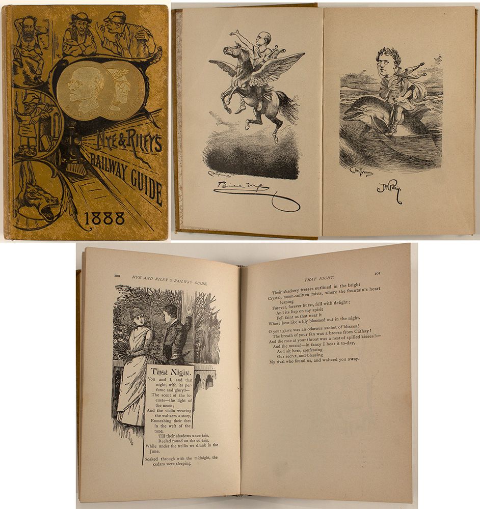 Written by humorists Edgar W. Nye and James Whitcomb Riley. The book features hilarious poems and illustrations. James Whitcomb Riley later became known for another famous work called "Little Orphan Annie." Published in Chicago by the Dearborn Publishing Co. 203 pages. Yellow pictorial cloth cover. The piece has very little wear. Rarity [v].City: County: State: Date: 1888