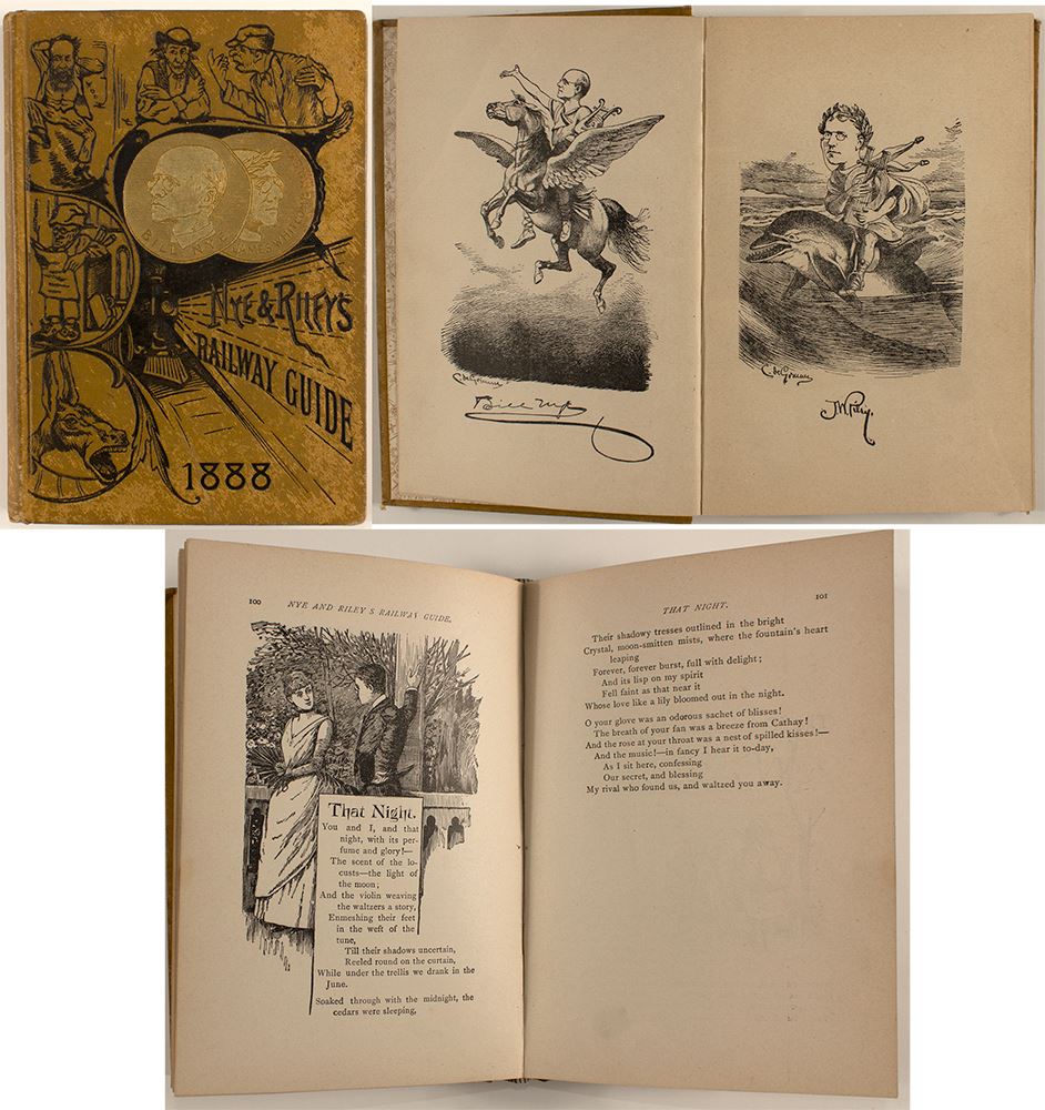 Written by humorists Edgar W. Nye and James Whitcomb Riley. The book features hilarious poems and illustrations. James Whitcomb Riley later became known for another famous work called "Little Orphan Annie." Published in Chicago by the Dearborn Publishing Co. 203 pages. Yellow pictorial cloth cover. The piece has very little wear. Rarity [v].