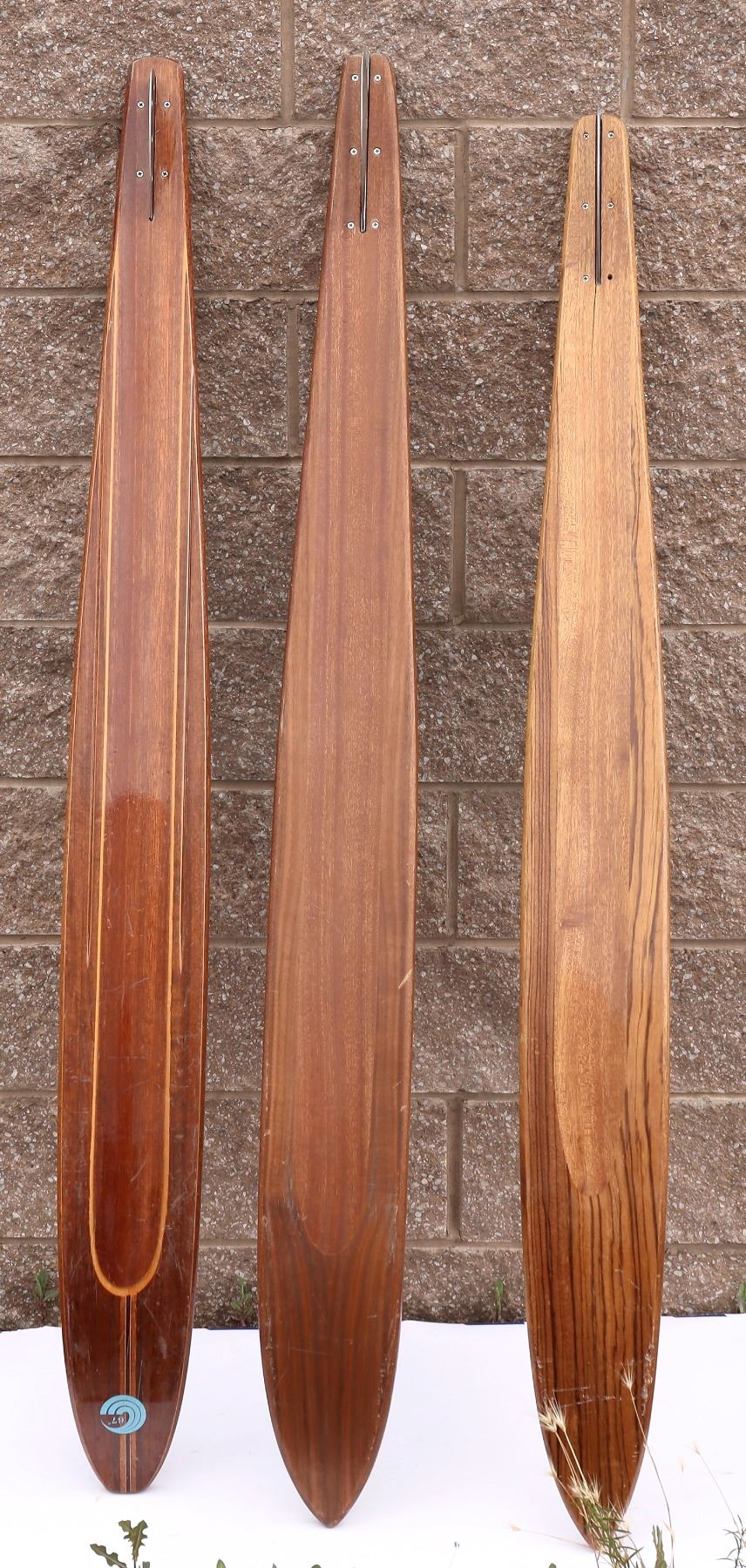 Lot of 3. Overall good condition including the boots. Models: Competition 66 and two 70 skis. One 70 has a metal OBrien nam plate on the heel section. These are very rare and hard to find in decent condition and wouldnt they look goos in that CHris Craft or antique natural wooden boat you have. 1960s
