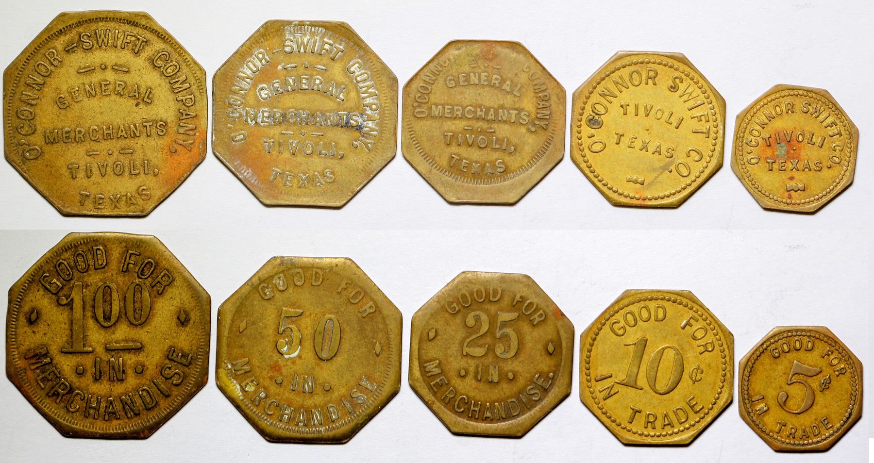 Five tokens GF 5c, 10c, 25c, 50c, and $1.00 IT, General Merchandise. State: Texas City: Tivoli Date: HWAC# 85358