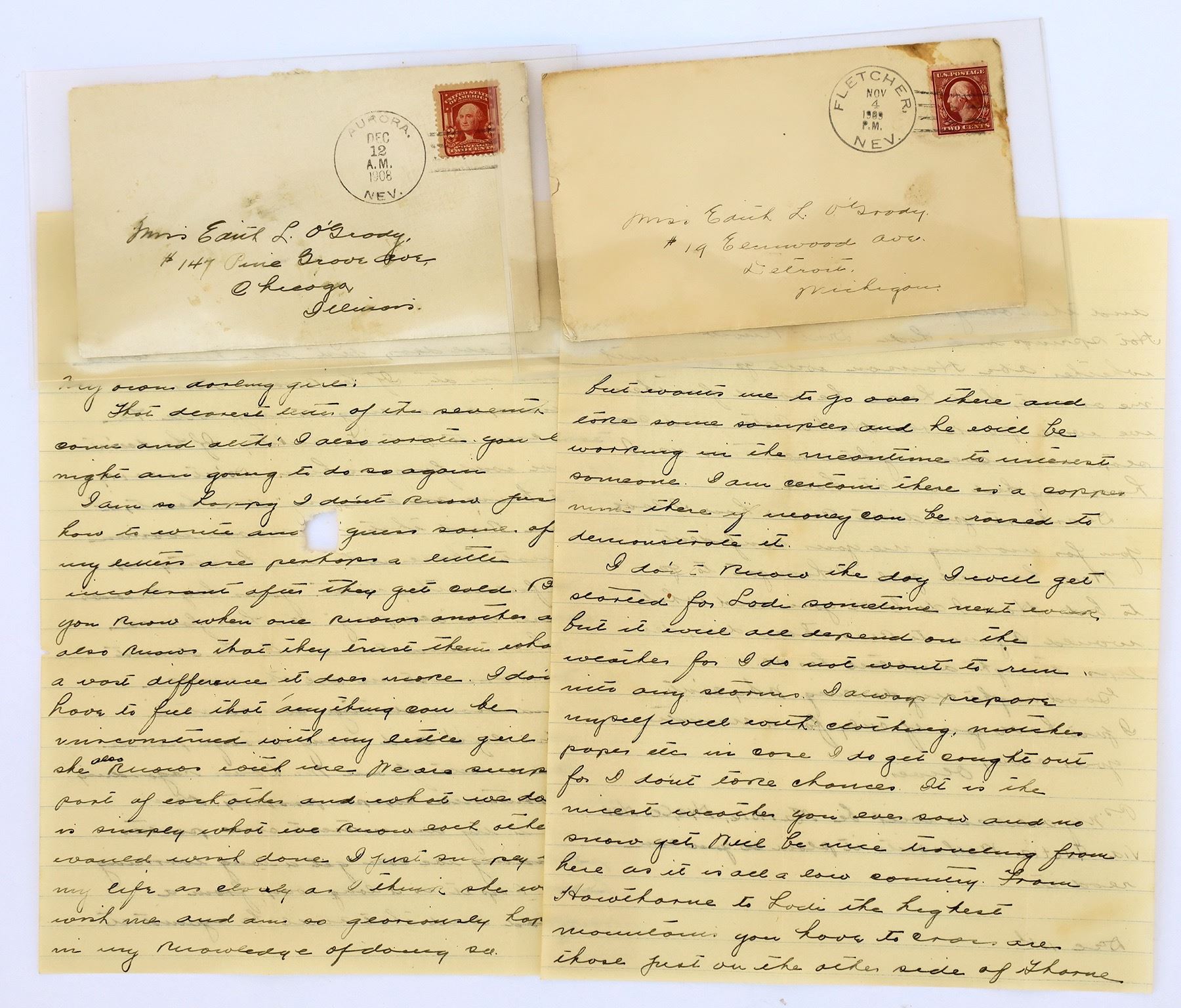Two covers. 1) Aurora. R3. 1908. Excellent strike. 2) Fletcher. Rarity-5. 1908. Nearly perfect strike. O'Grady correspondence (mining man), "received a letter from Mr. Davis about the Grantsville property, "Davis is trying to find investors", O'Grady is heading to Lodi next week, his address will be Marble. Four page letter with interesting content. Biography on Edith O'Grady.