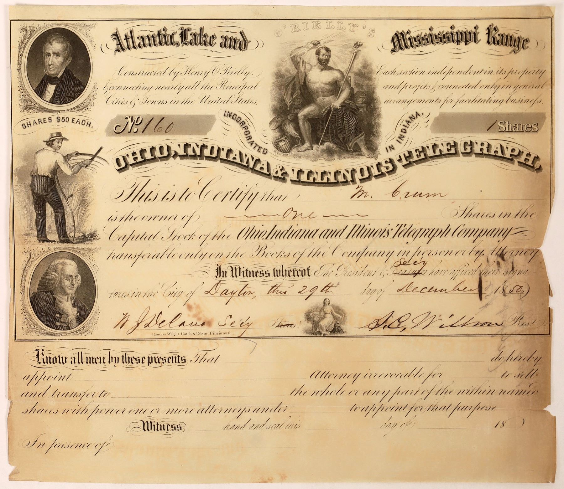 Incorporated in Indiana. No. 160, issued for one share to M. Crum on December 29th, 1850 in Dayton. Signed by president SC Willson and secretary Delano. Not cancelled. Folds, tears, heavy toning. Black border and print, five vignettes incl. Ben Franklin, a farmer, Zeus, and others. Printed by Rawdon, Wright, Hatch & Edson, Cincinnati. 7.5 x 8.75"