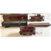 O-scale with Scale trucks. One Box Car, Pennsylvania Railroad. One small Caboose, tuscan in color. One Caboose, marked Pennsylvania RR, tuscan. One Gondola with coal, Santa Fe Railroad. One Flat Car, made of wood. C7-8.