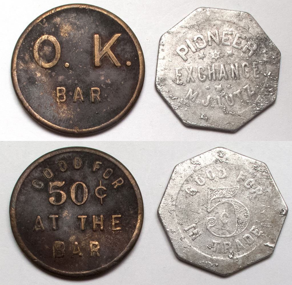 Two tokens attributed to Nevada, but probably aren't. 1) OK Bar. Good for 50c at the bar. 2) Pioneer Exchange, M. J. Lutz. GF 5c IT. This one definitely seems to be Washington. A little porous. From the Maish Collection of Nevada Tokens!