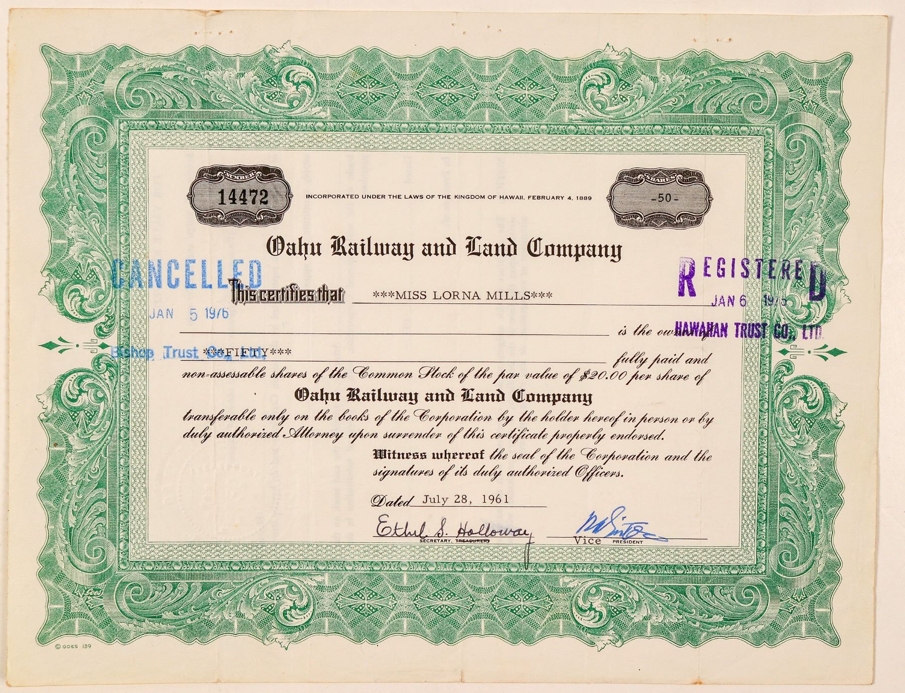 Inc. in the Kingdom of Hawaii, 1889. No. 14472, issued for 50 shares to Miss Lorna Mills on July 28th, 1961. Signed by the vice-president and secretary. Stamp cancelled. Green border and black print. Folds, staple holes. 8.5 x 11" Founded by Benjamin Dillingham. Largely serviced sugar plantations on Oahu. After the December 7, 1941 attack on Pearl Harbor, the OR&L became a major player in wartime transportation. The railroad carried out its regular freight operations as well as handling massive amounts of military-related traffic. Ken Prag Collection