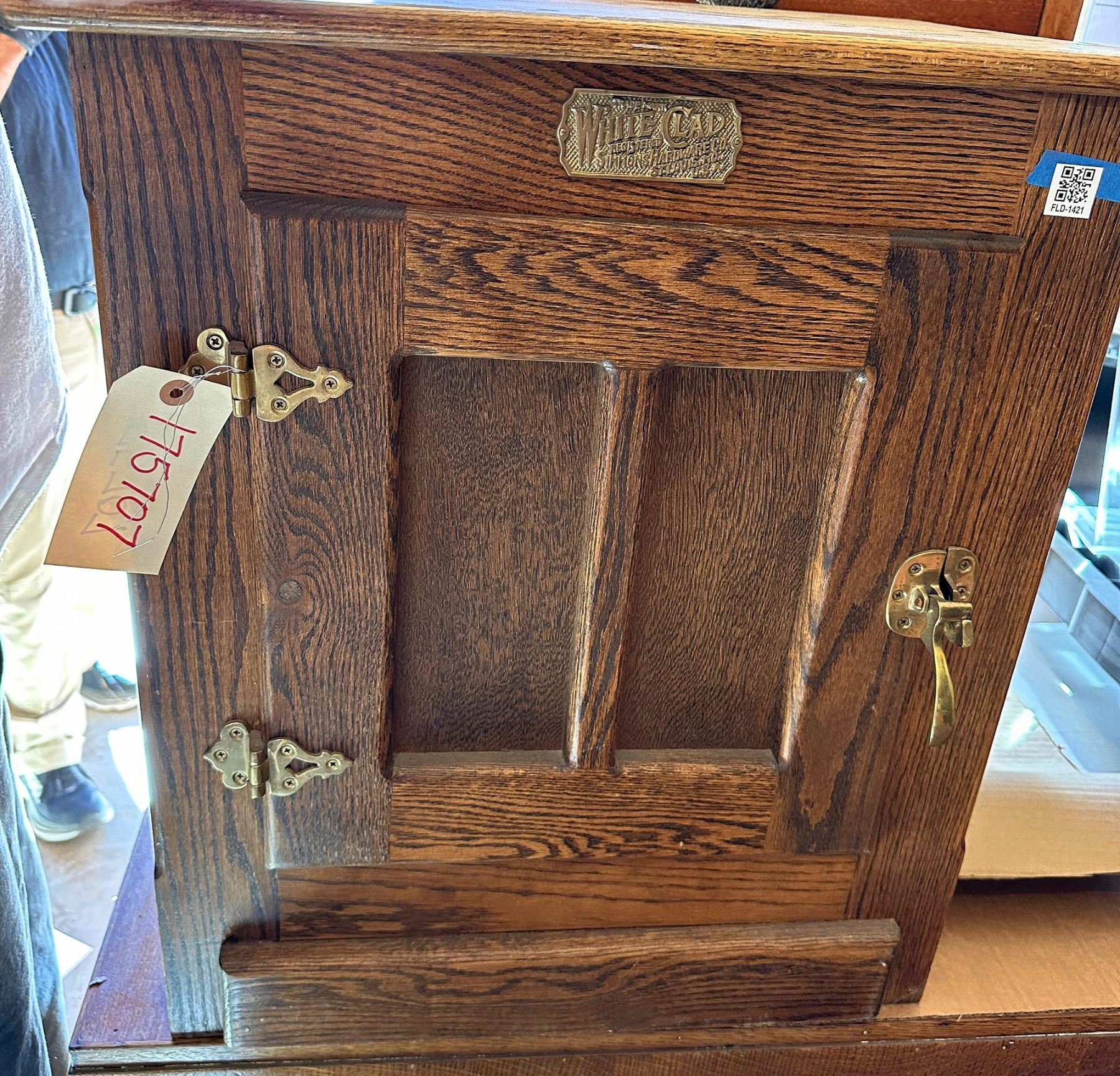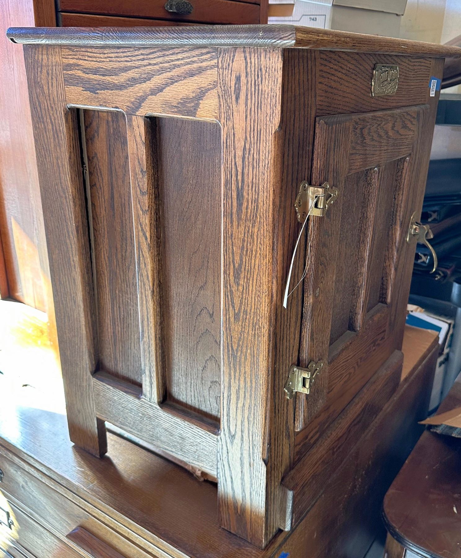 22 1/2 x 16 1/2, 26 inches high. Oak construction, single door, reproduction of an early oak refrigerator. Brass plaque reads: Simmons Hardware Co. St. Louis.