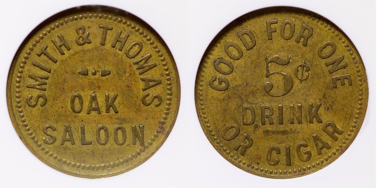 Obv.: Smith & Thomas / Oak / Saloon; Rev.: Good For / 5c / Drink / Or Cigar; Rd., 24mm, NGC AU 50. City: Parkersburg State: Texas Date: hwac# 36024