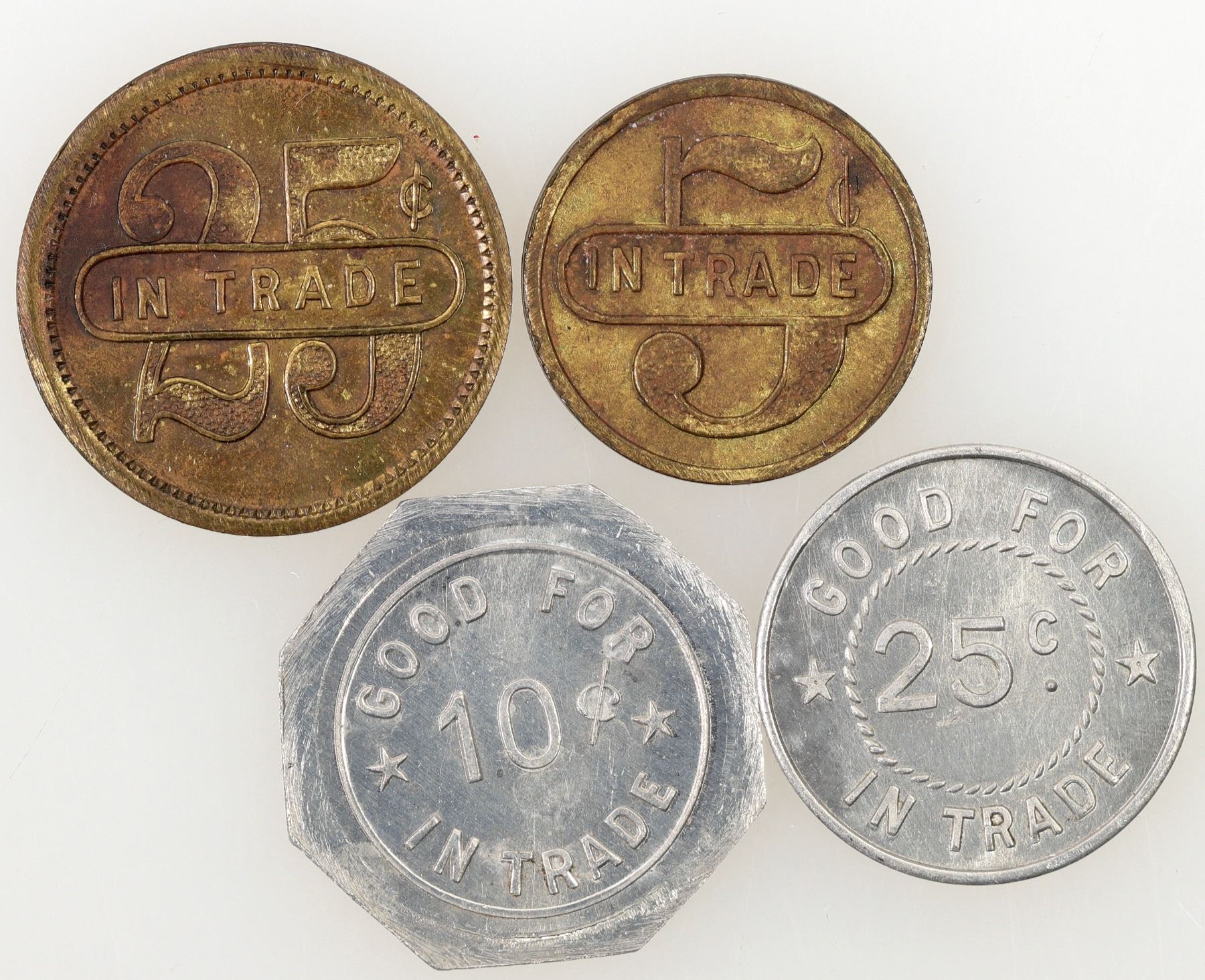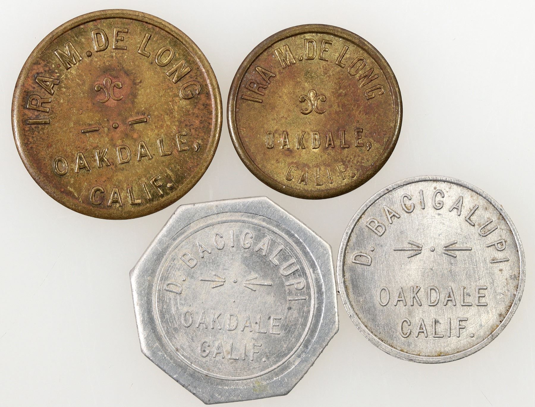 4 Oakdale tokens, all different. 2x D Bacigalupi, 2x Ira M Delong. California Oakdale