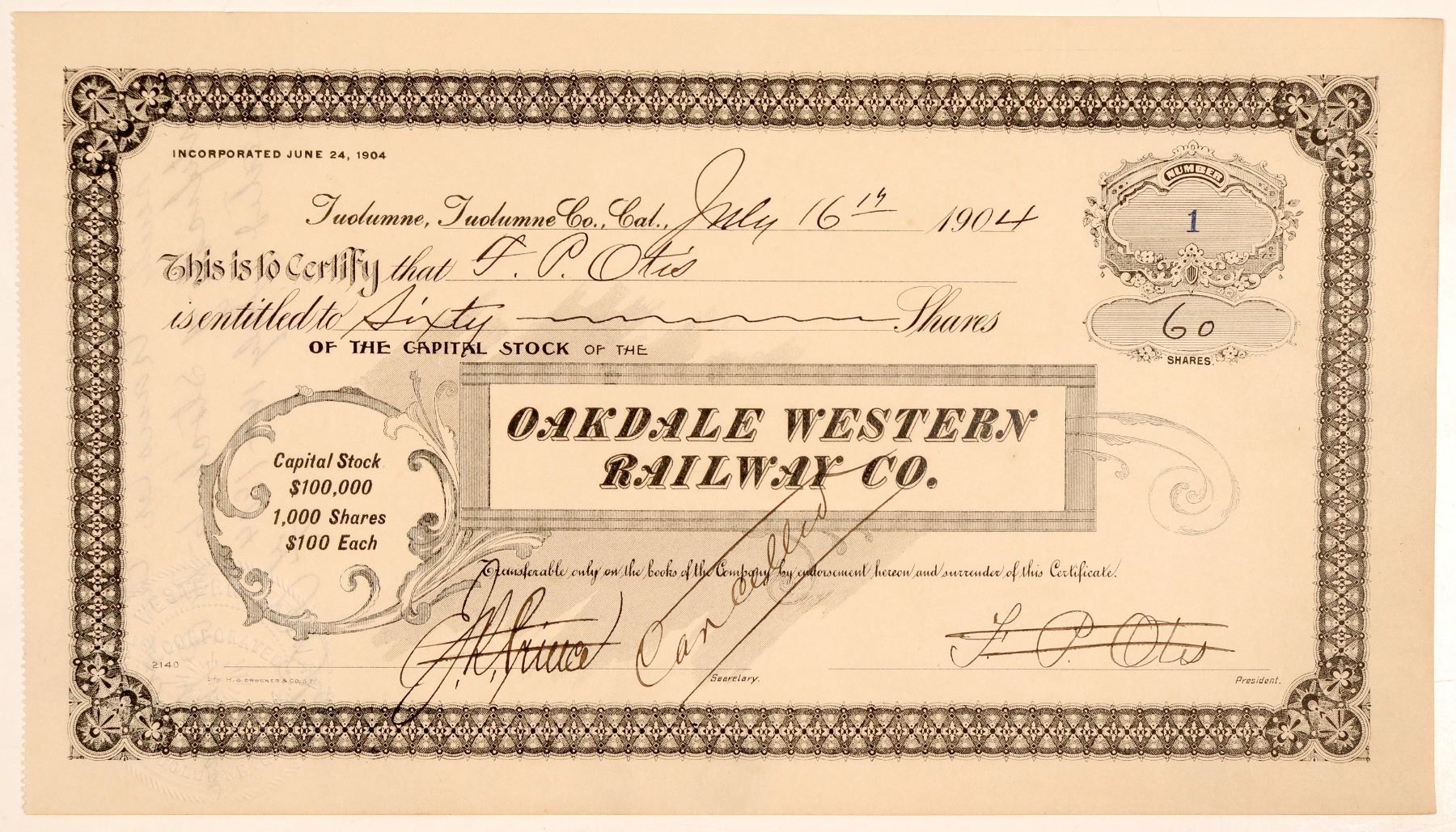 #1, I/C, 60 shares @ $100 par issued to F.P. Otis July 16, 1904. Signed F.P. Otis President. BLACK, embossed seal, no vignette, handwritten note of transfer on reverse signed F.P. Otis. This owners certificate is the only one known to exist. EF cond. Ken Prag Collection