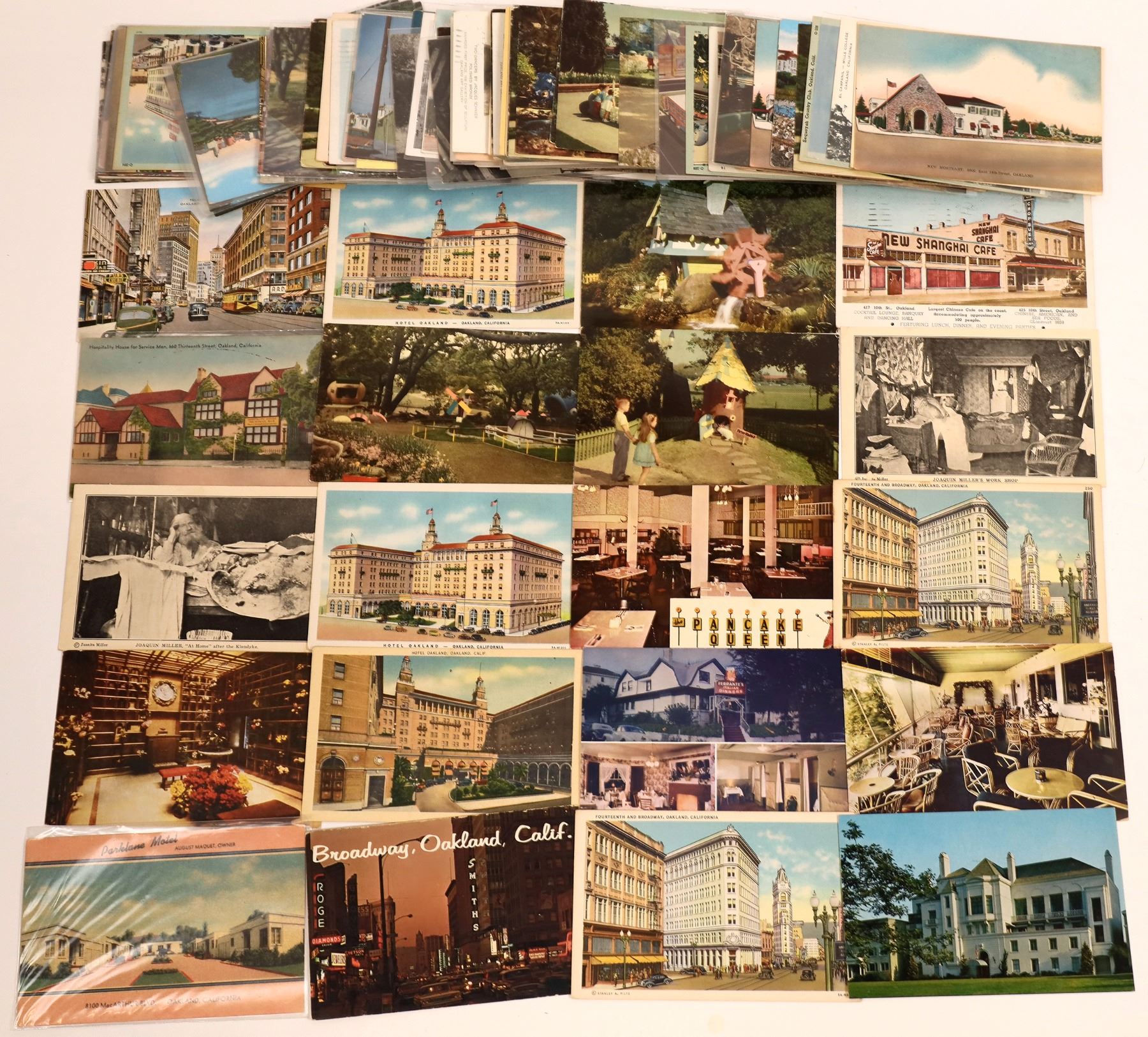 Lot of approx. 100. Color and B/W, white borders and borderless. Seventeen postmarked 1930-59 : Richmond, Oakland, Alameda, 1-3 cent stamps, one has 20c George C. Marshall stamp. Amongst the usual bldgs., parks, churches, street scenes is a collection series of 15 B/W, borderless postcards of Street Car Companies. #6 and 14 missing.. Several photo cards of Joaquin Miller. State:California City:Oakland Date:1930-59 Provenance: Ken Prag Collection