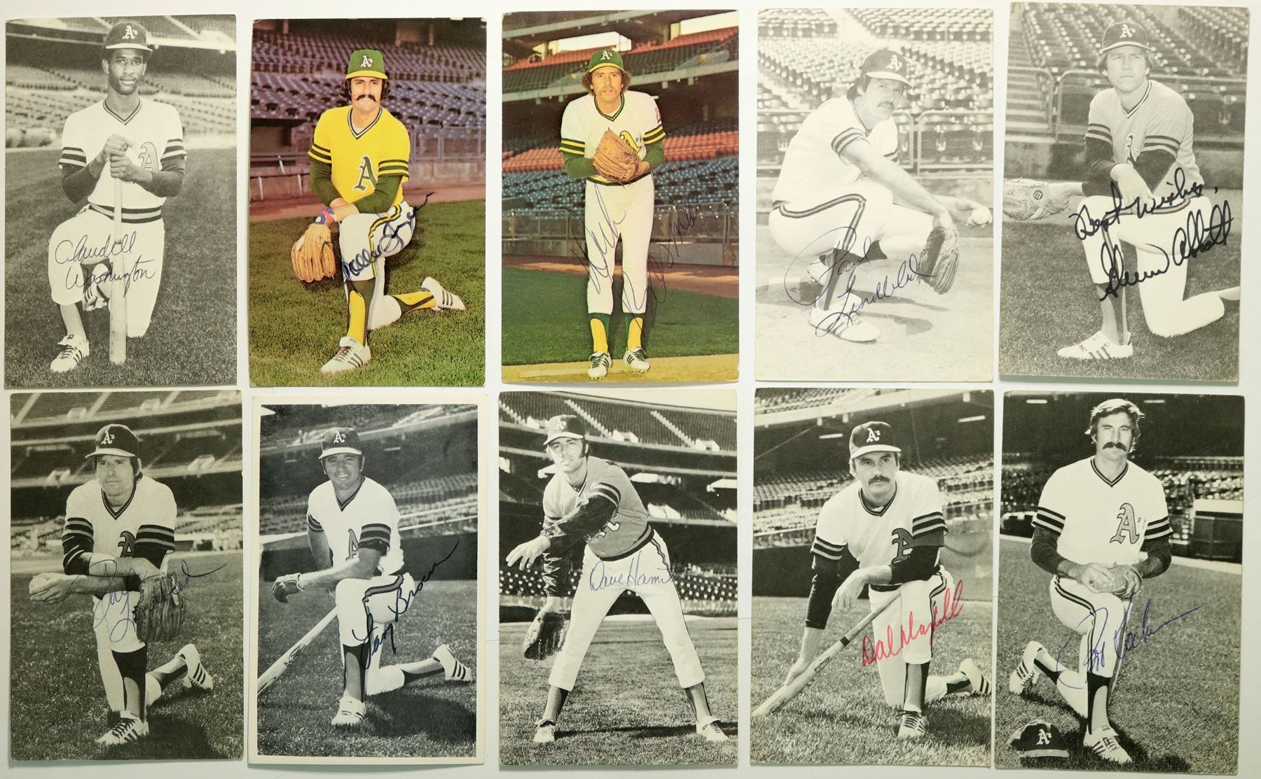 Lot (10 in all) of the of the Swingin' A's: Paul Linblad, Larry Brown, Dave Hamilton, Dal Maxvill, Claudell Washington, Bob Locker, Glenn Abbott, Rollie Fingers, Dick Bosman.