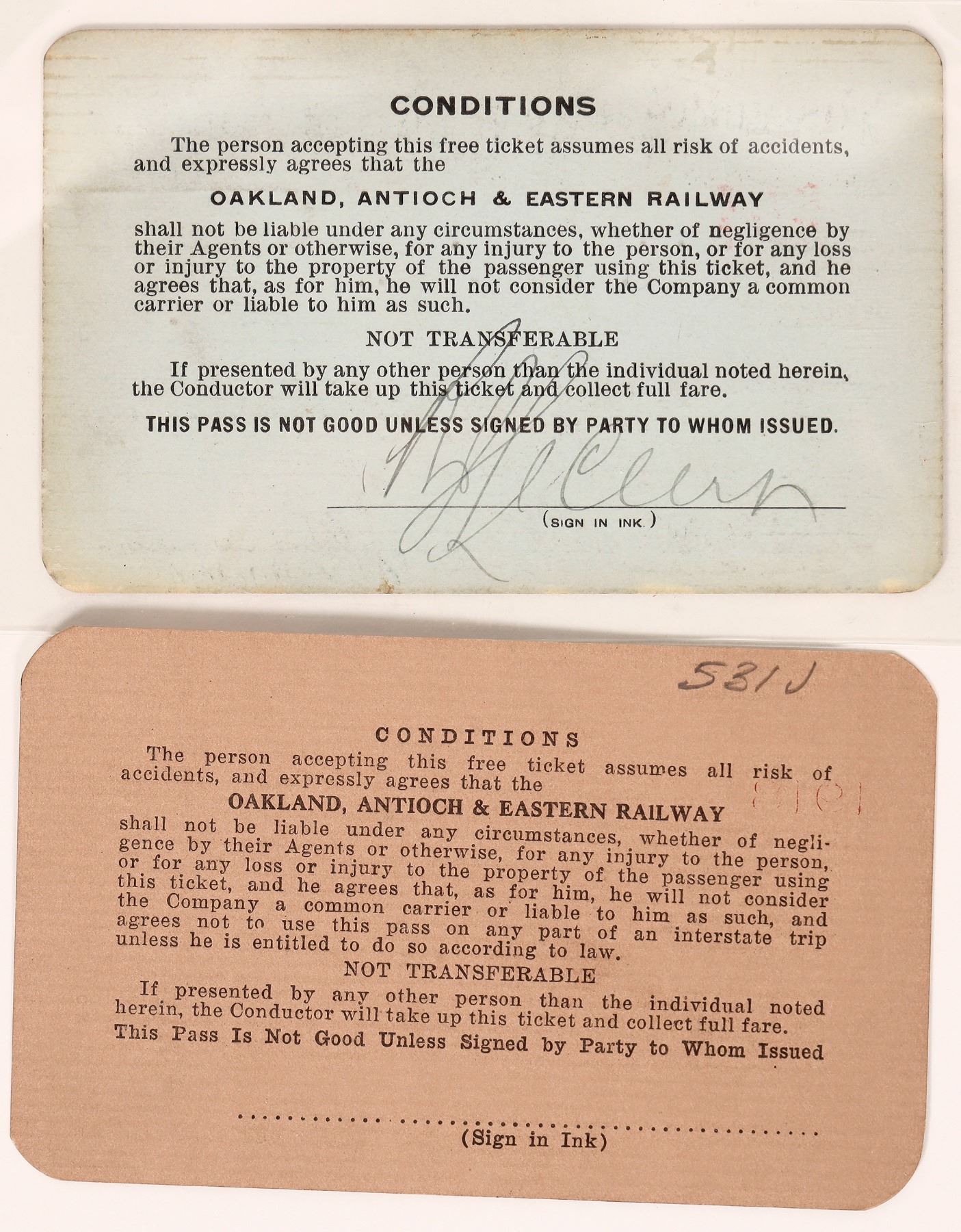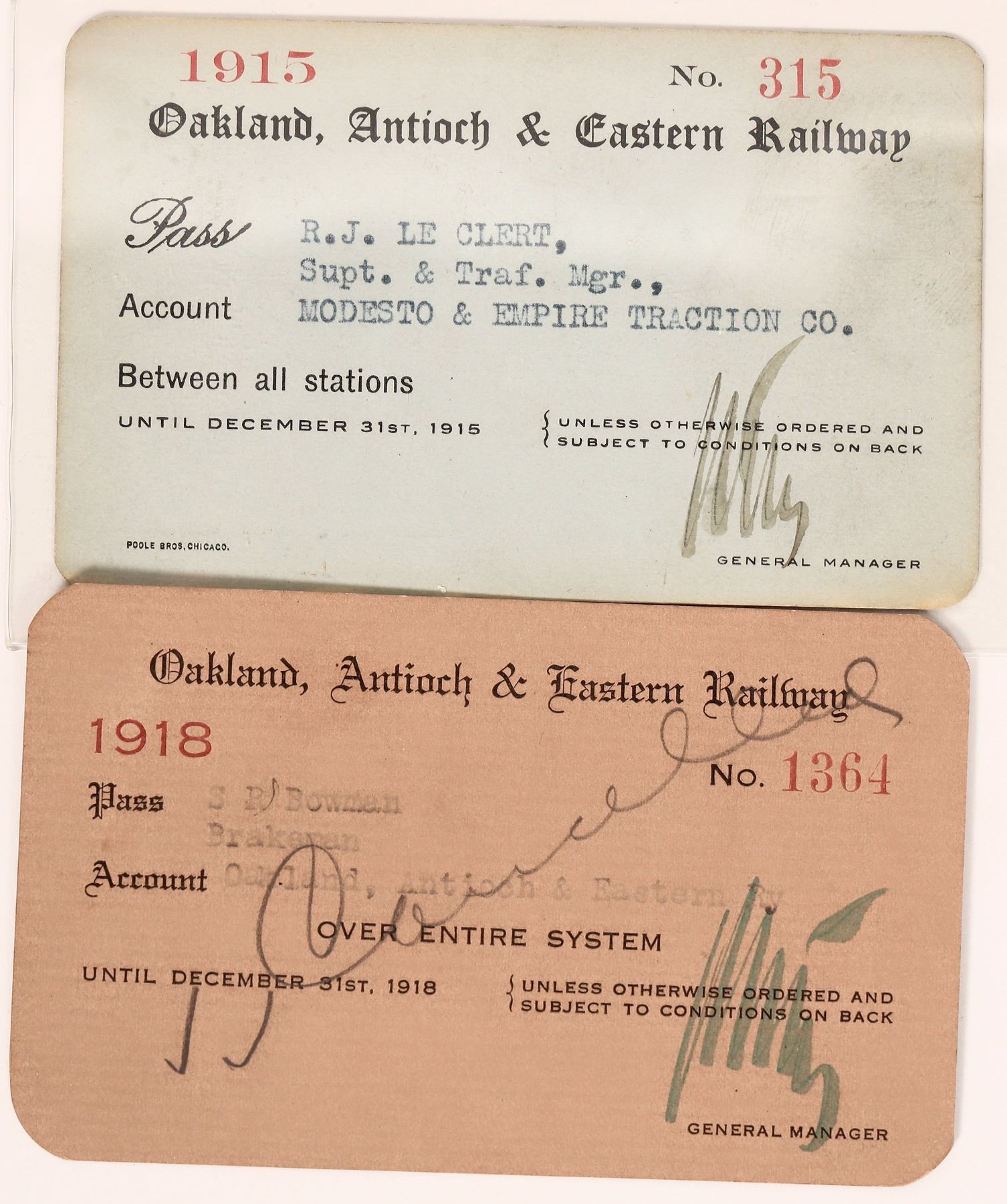 Lot of 2. #315, issued 1915, blue card stock, R J Le Clert Modesto & Empire Traction Co. between all stations. #1364, issued 1918, brn card stock, S R Bowman brakeman OA&E over entire system (cancelled, handwritten). Incorp. San Francisco March 1911, in 1920 sold to San Francisco-Sacramento Railroad Co.