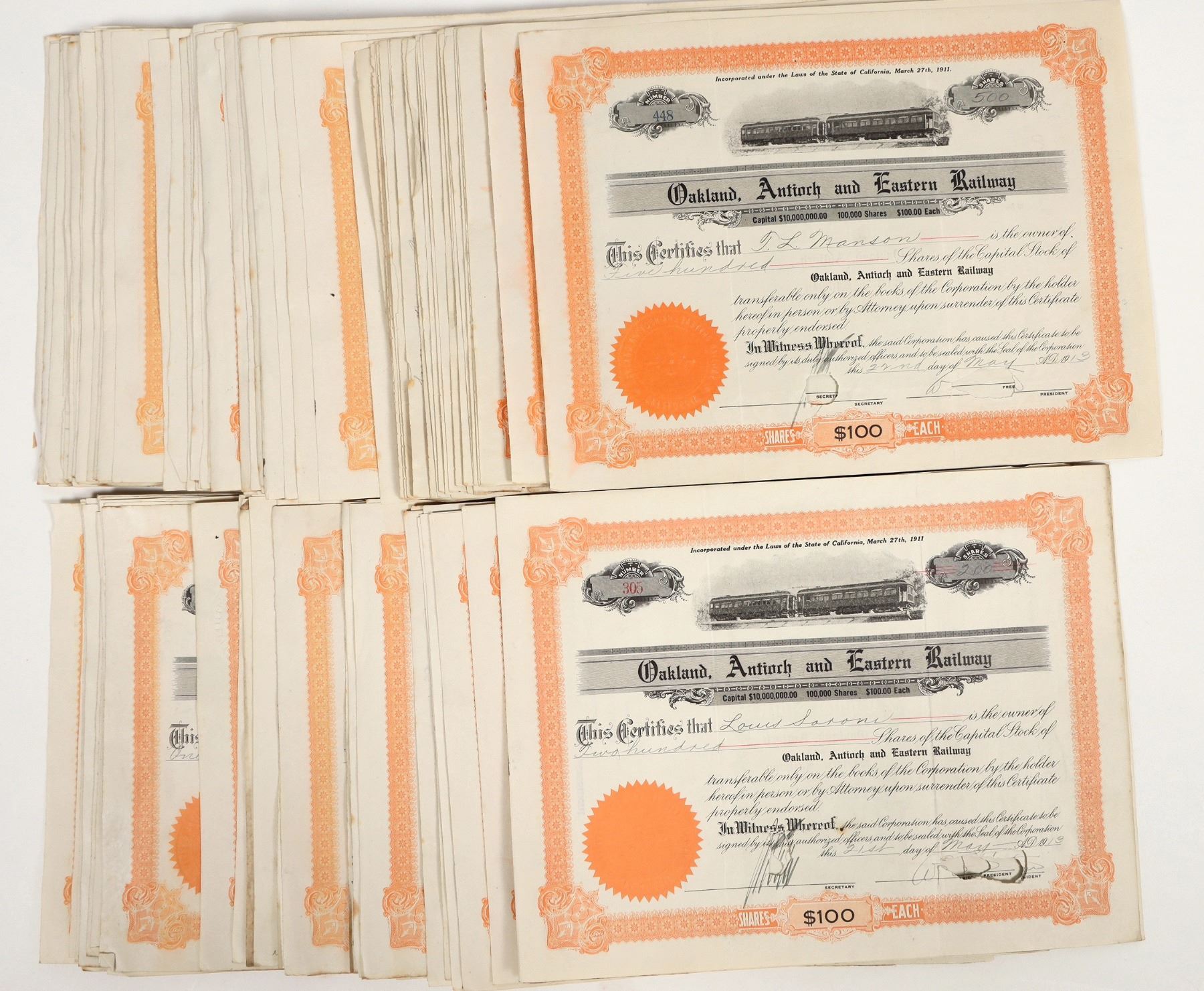 Approx. 90. All I/C. Issued 1913. VG cond. Oakland, Antioch and Eastern Railway . These are cancelled either by written word or a tear over the presidents signature. . Nice railcar vignette