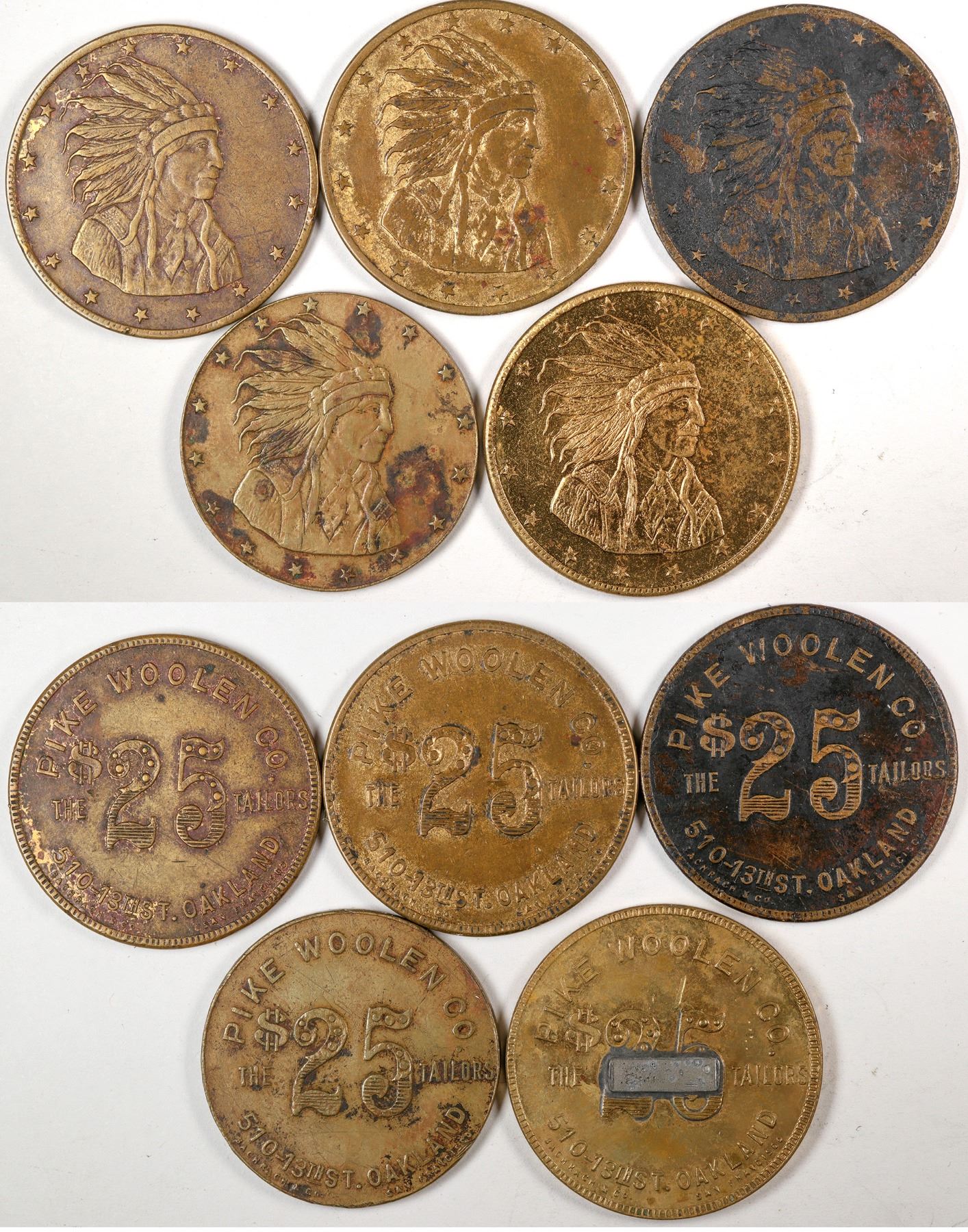 Lot of five: Obv.: Childs Indian Head and stars; Rev.: Pike Woolen Co. /$25 / The Tailors / 510 13th St. Oakland. Br., rd., 31 mm, K-411.. Very rare die sinker: Bachrach, of San Francisco.