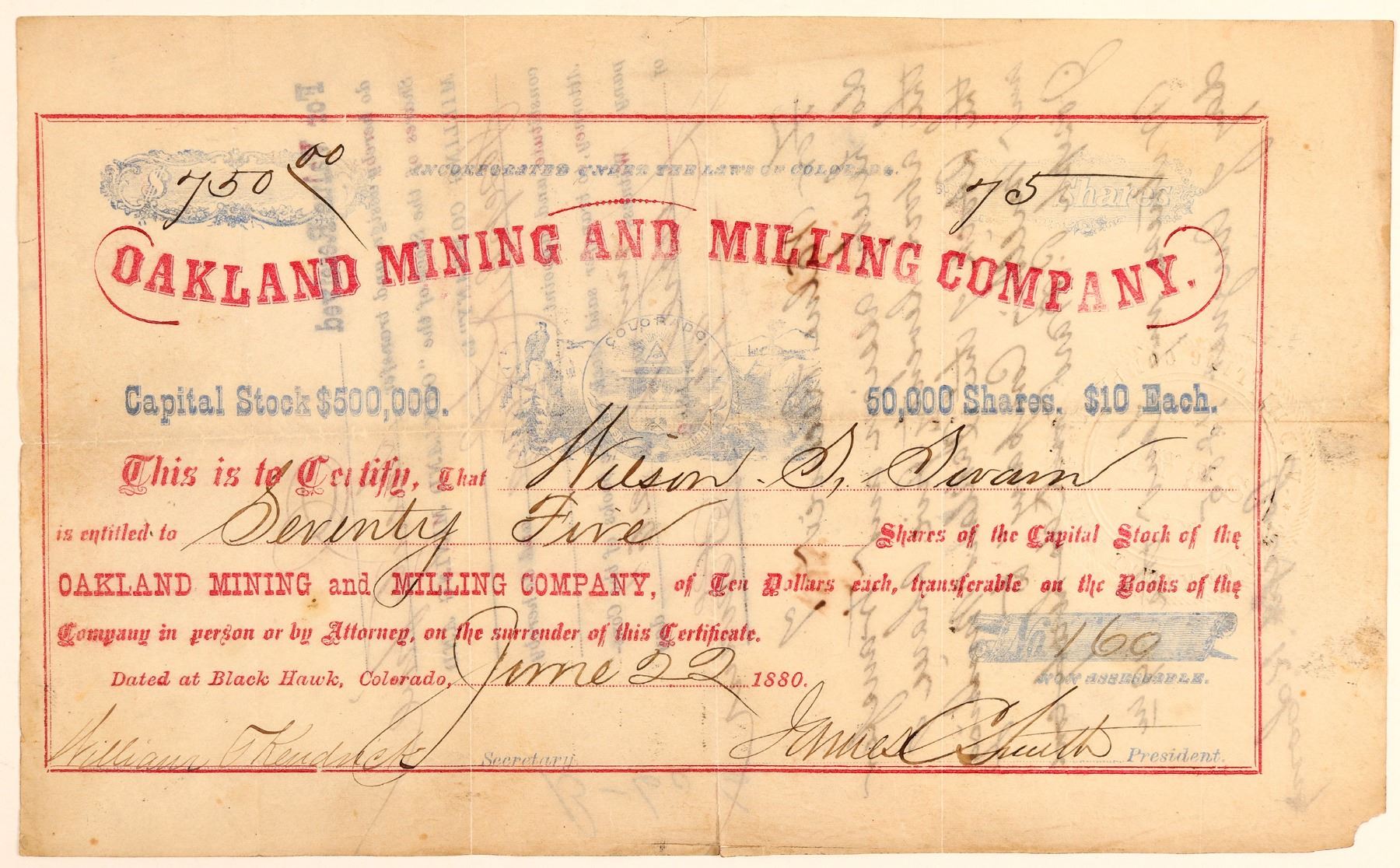 Dateline Black Hawk, Colorado, June 22, 1880. Issued for 75 shares to Wilson S. Swain. Signed by president James C. Smith and secretary Kendrick. Not cancelled. Red and blue print with background vignette of eagle next to Colorado state seal. No printer listed. 5.5 x 9.25" Horizontal and vertical folds, one separation, soiling, and missing lower right corner. According to E&MJ, Vol. 30, the company owned the Paoloa Mine, the "first well-known vein parallel to the Harsh Lode." They are removing water that filled the double-compartment 80 ft. shaft during the rainy season. "The mine had not been worked for some time when the present management took hold of it" (1880, pg. 254-255). Not in Corbett or Corregan & Lingane. () Ken Prag Collection