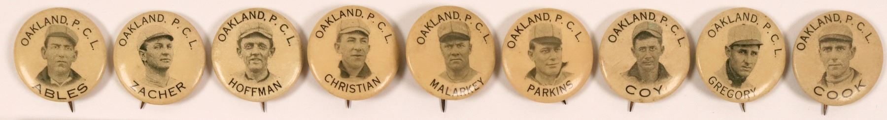 Lot of nine photo pins made by the Whitehead & Hoag Co. of San Francisco, patented 1896, these 22 mm pins probably date from around 1910. The players: Cook, Hoffman, Gregory, Parkins, Christian, Ables, Zacher, Coy, Malarkey. The Oakland Oaks were a minor league baseball team that played in the Pacific Coast League from 1903 through 1955.
