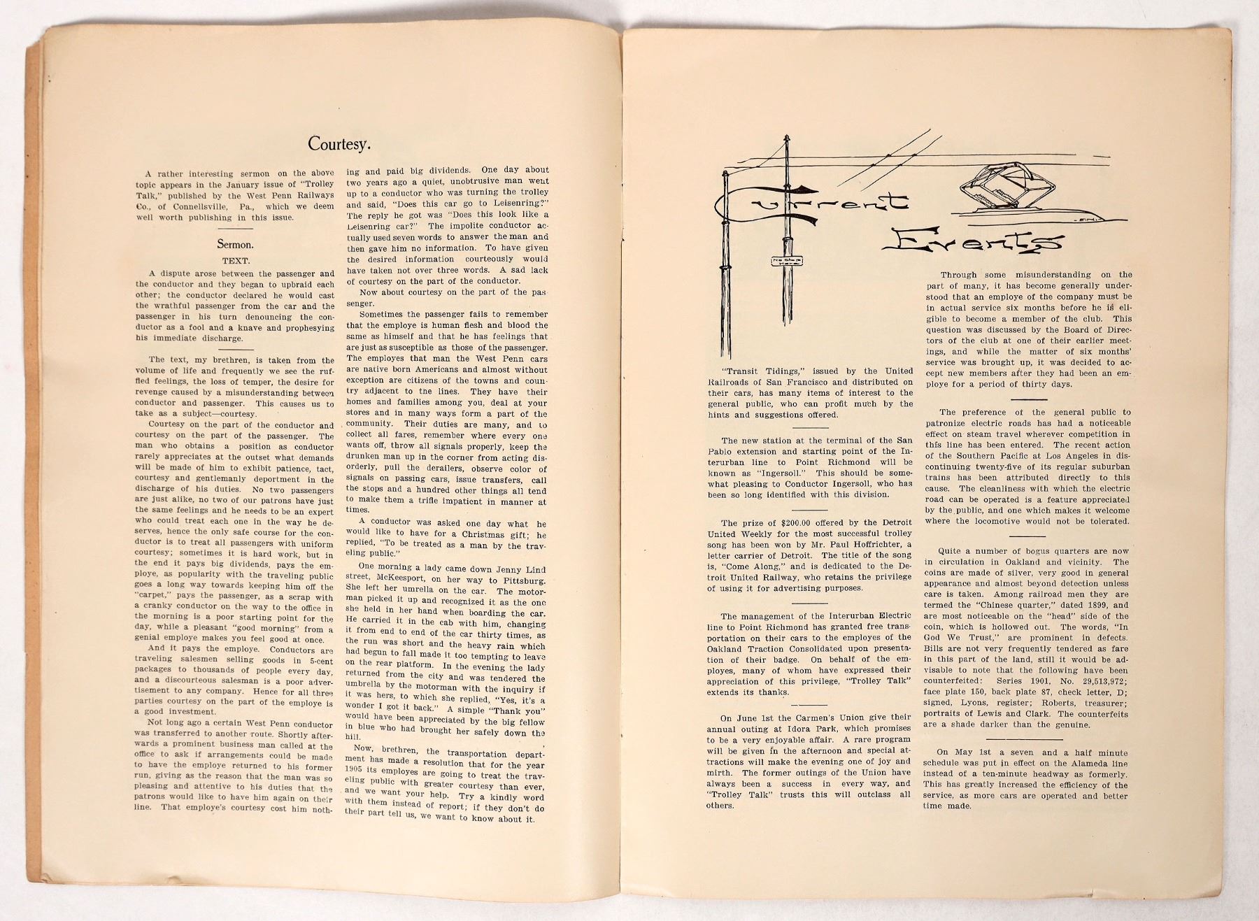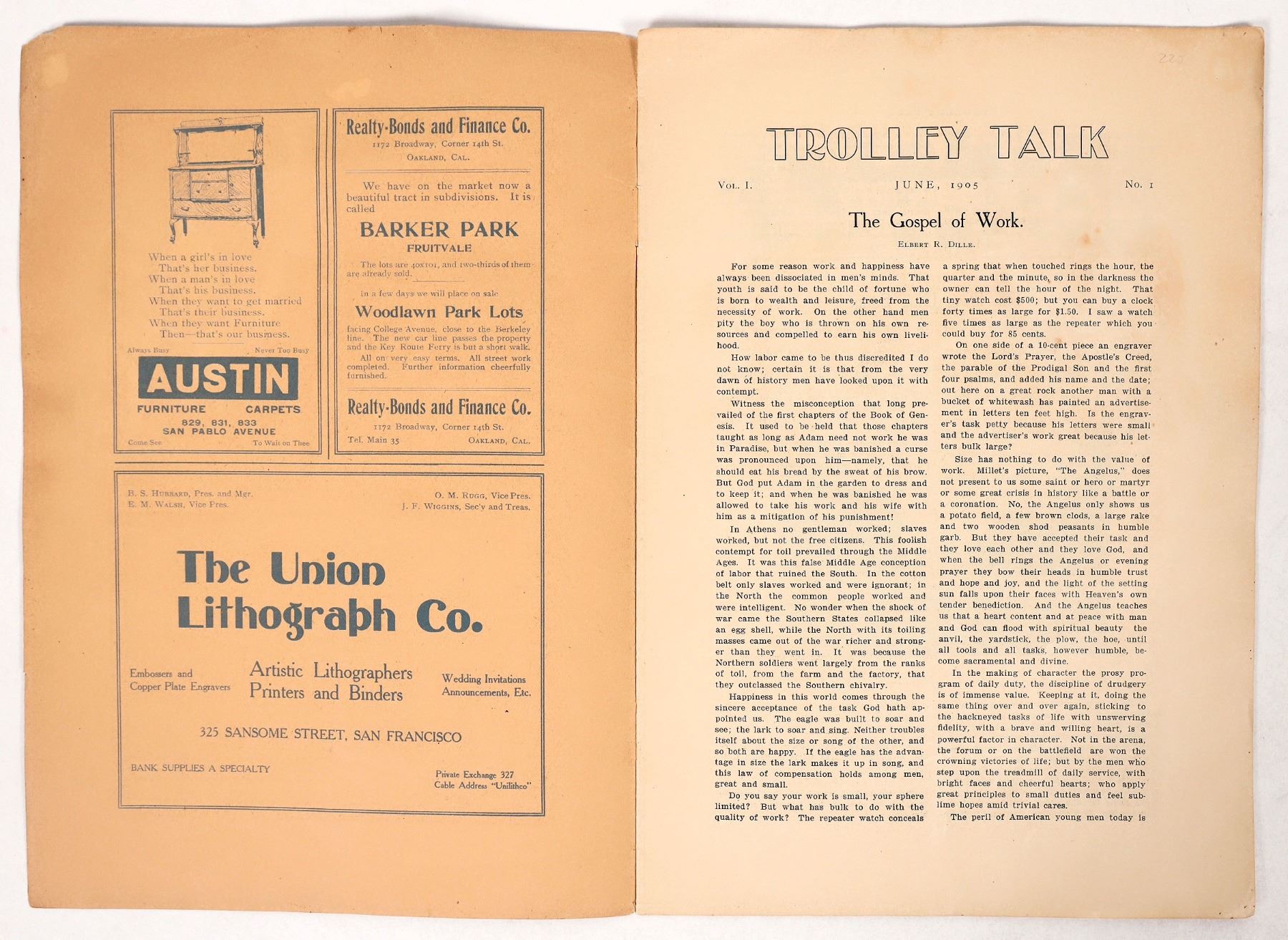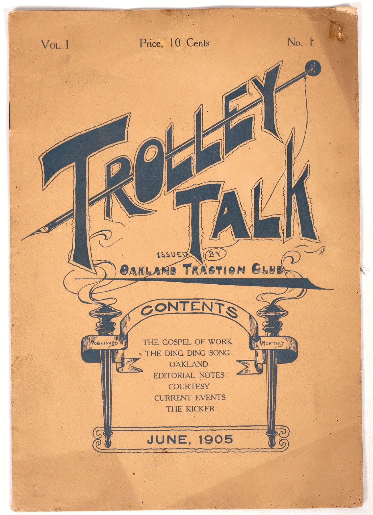 Rare issue 1 volume 1 of Trolley Talk by Oakland Traction Co. 16pp with ads and Oakland photos and events. "In 1906, the narrow gauge was converted to standard gauge, which helped the consolidation of the Oakland Transit Company and the Oakland, San Leandro and Haywards Electric Railway under the name Oakland Traction Company. In 1908, the line was absorbed by Francis Marian "Borax" Smith's transportation empire and became an important link in his efforts to consolidate East Bay Transit. After several more consolidations and reinventions, the Oakland Traction Company line would eventually be known as the Key System." from haywardareahistory.org. Upper spine has 1" split, some toning etc.