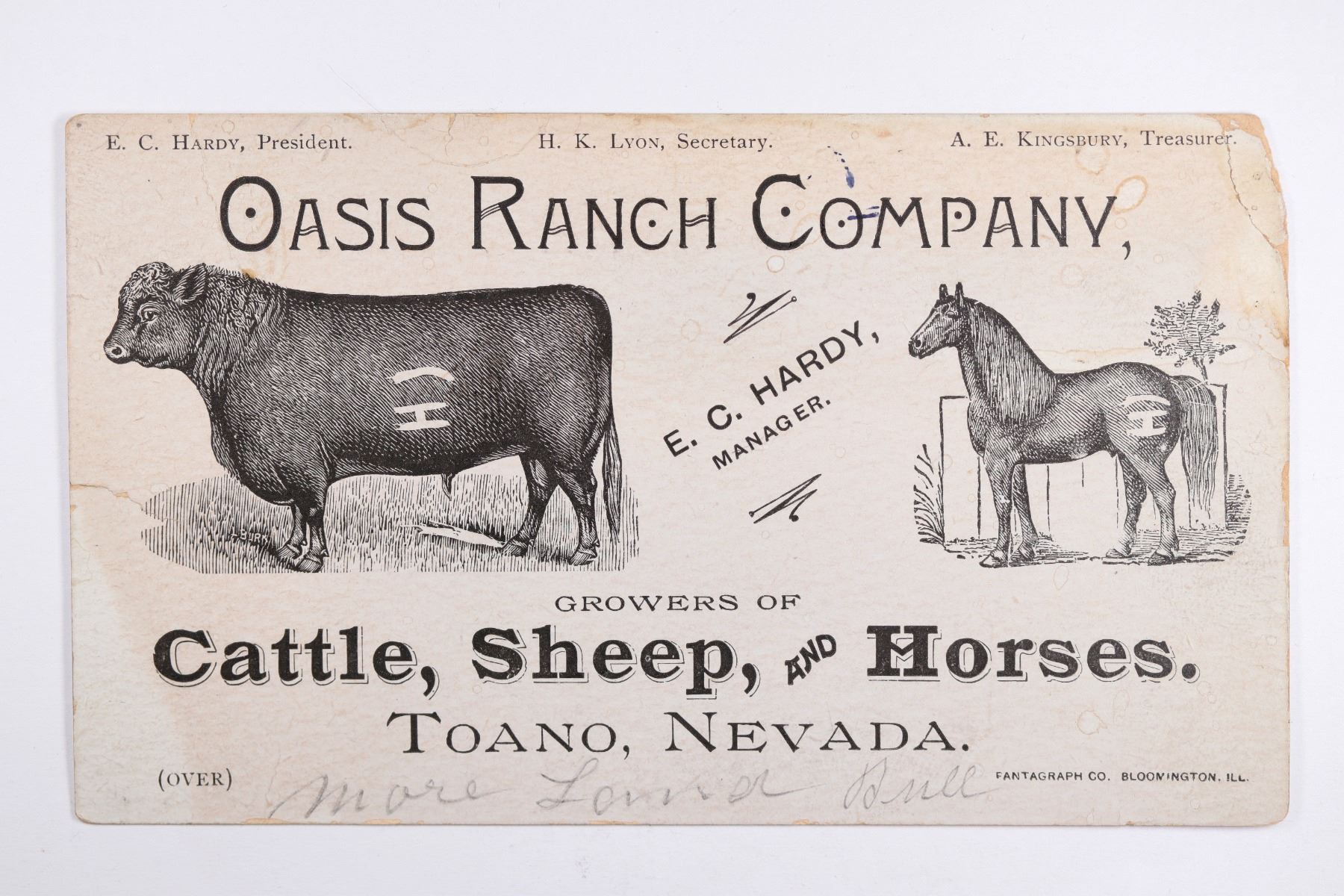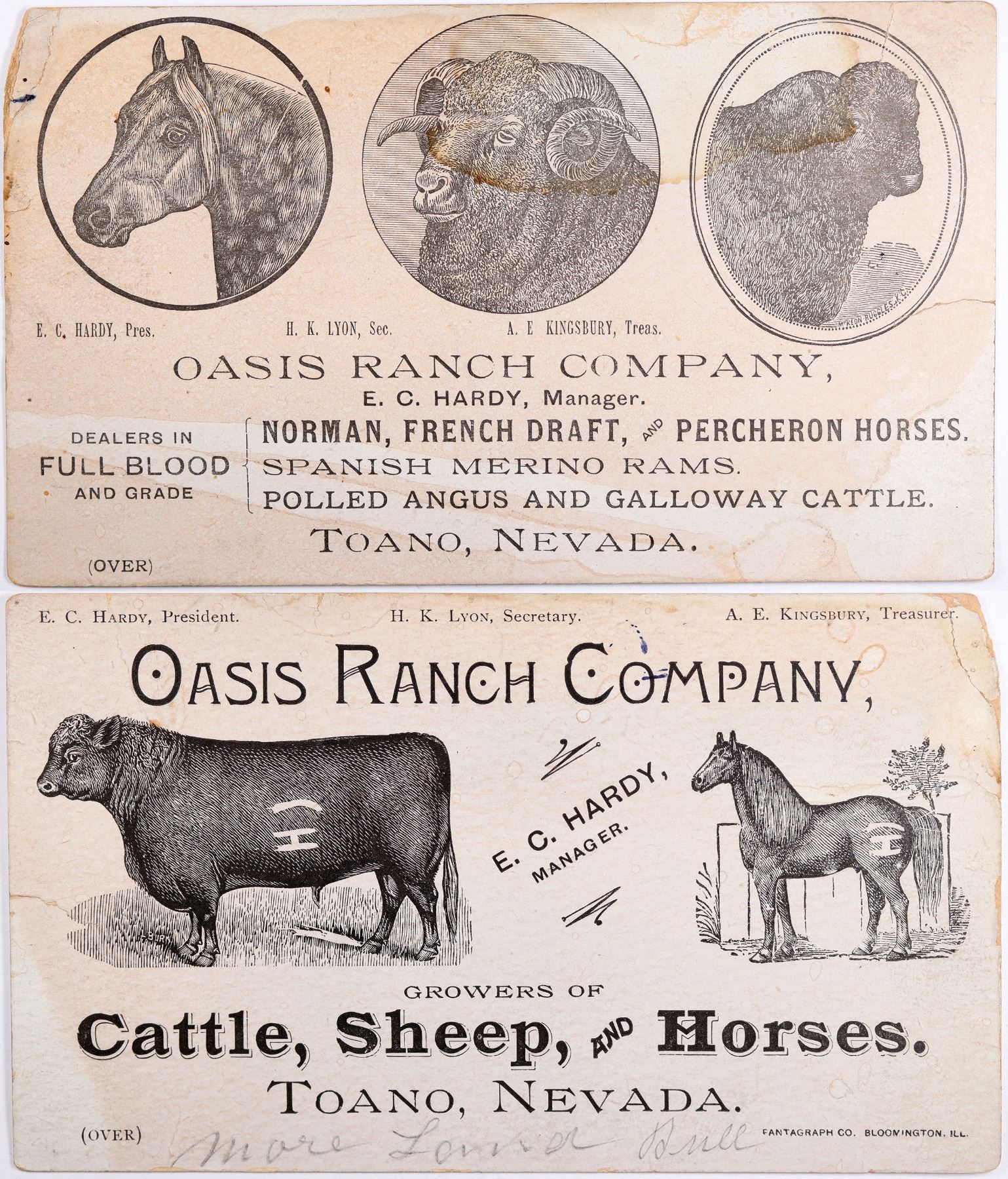 Oasis Ranch Company, Growers of Cattle, Sheep, and Horses. Toana, Nevada. E.C. Hardy, President and Manager, H.K. Lyon, Secretary, A. E. Kingsbury, Treasurer. Picture of Cow and Horse on front. See images.