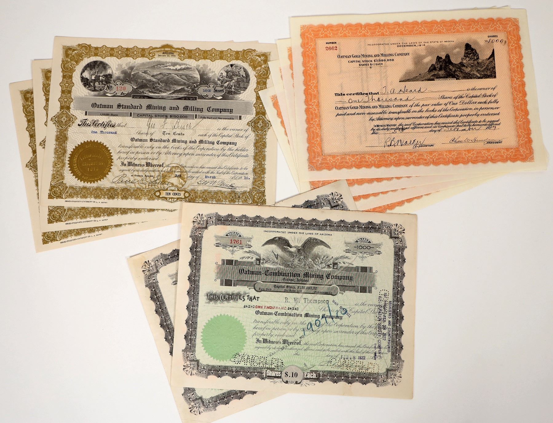 Issued-4x 1927 Oatman Gold Mining and Milling, 4x 1916 Oatman Standard Mining and Milling, 2x 1922 Oatman-Combination.