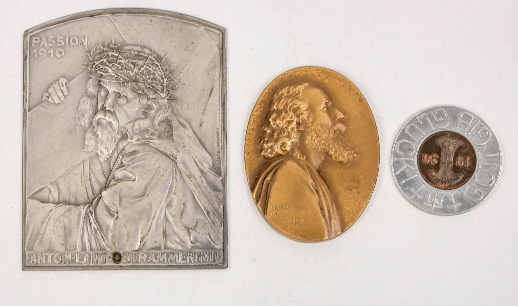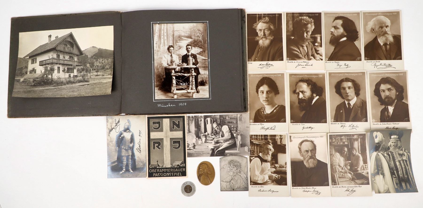 Oberammergau is a town in the Bavarian Alps, Germany. It's known for its once-a-decade performance of the Passion Play in the Passion Play Theater since 1633! The last play was in 2022, having been postponed from 2020 by the Covid epidemic. This is an amazing archive of the Passion Play from about 1900 to circa 1930. The Lang Family (especially Anton Lang) is featured: several items are rare. About 40 photos in "Amateur-Album": many Langs identified, private homes, artists at work; Cast silver 1910 medal of Anton (60 X 77 mm); encased one pfenning 1930 "God Is Luck" aluminum casing; oval medallion of Lang 1924; Oberammergau in America; eleven 1922 post cards featuring the family; 1909 signed real photo postcard of A. Lang.