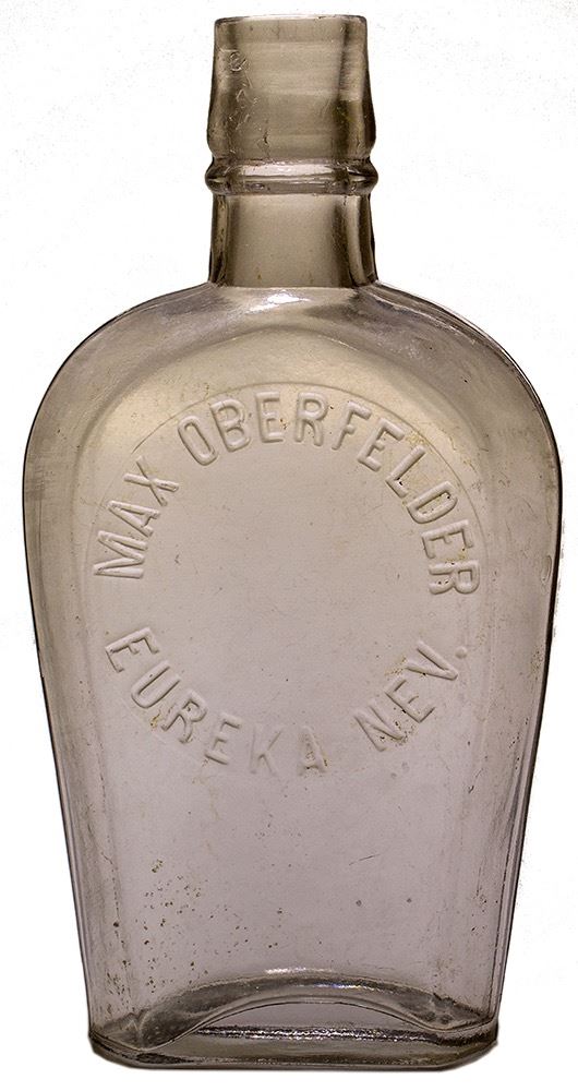Max Oberfelder clear half pint coffin whiskey flask from Eureka, Nevada. This flask is in remarkable mint condition. It comes with an unusual story since it was found in Kentucky. Oberfelder ran a saloon in Eureka from about 1877 to 1880. He came from the whiskey manufacturing business in Louisville, Kentucky during the early 1870s. Evidently Oberfelder or one of his family members visited Eureka and took home one of the Eureka bottles to Kentucky. For a more detailed story on Oberfelder, see Holabird Pages 221 through 226, Nevada History Through Glass, Volume One. City: Eureka State: Nevada Inventory Number: 38904