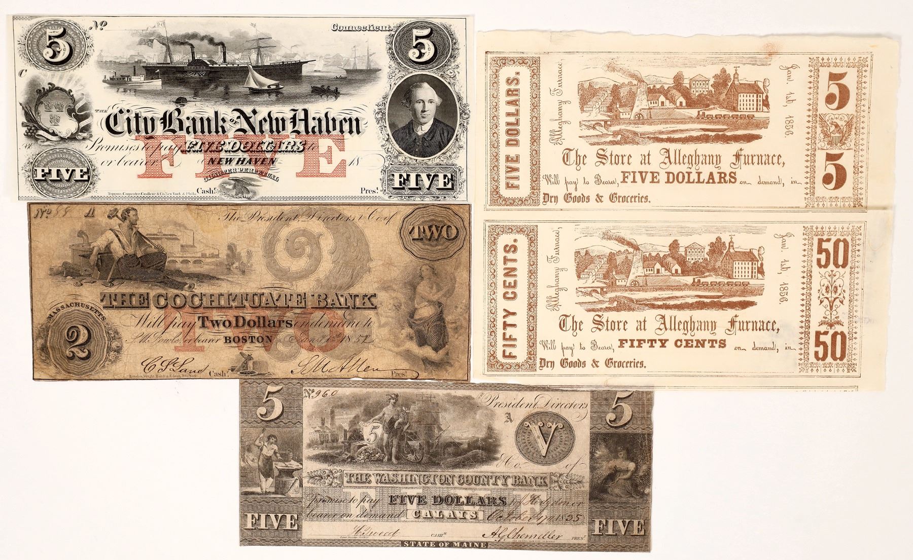 Four pieces of obsolete currency: 1) City Bank of New Haven, Connecticut $5 remainder note, CU, steamship vignette. 2) Cochituate Bank Boston, Massachusetts, $2 1851, F-VF. 3) Washington County Bank, Calais, Maine, 1835 $5, F-EF. 4) The Store at Alleghany Furnace currency scrip, uncut pair, 50c & $5, June 1, 1856.