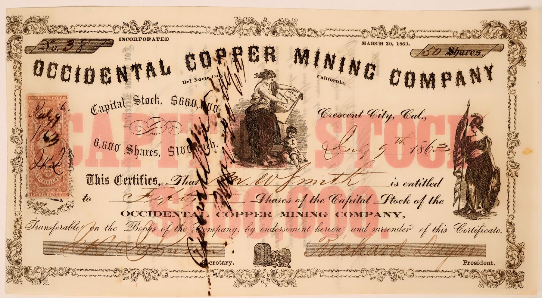 Very nice looking cert. Black on off white with large red underprint "Capital Stock $660,000. Early # 38 for 50 shares to MW Smith on July 9, 1863. Signed by Richard Dugan (president) and company secretary JK Johnson. Ledges include: Baxter, Mary-Delphia, Santa Clara, North American, San Fernando, NB Johnson and Homestead. Sailor and sailing ship vignette. Agnew & Deffebach printer. Dog ear lower right, otherwise no edge, corner, pin hole or discoloration issues. This company probably had a prospect in the Soledad District, but was not a working mine in 1870. At that time there was only a single mine left in the district. [Browne 1868]. President John Johnson was listed as a merchant in the 1862 San Francisco Directory.
