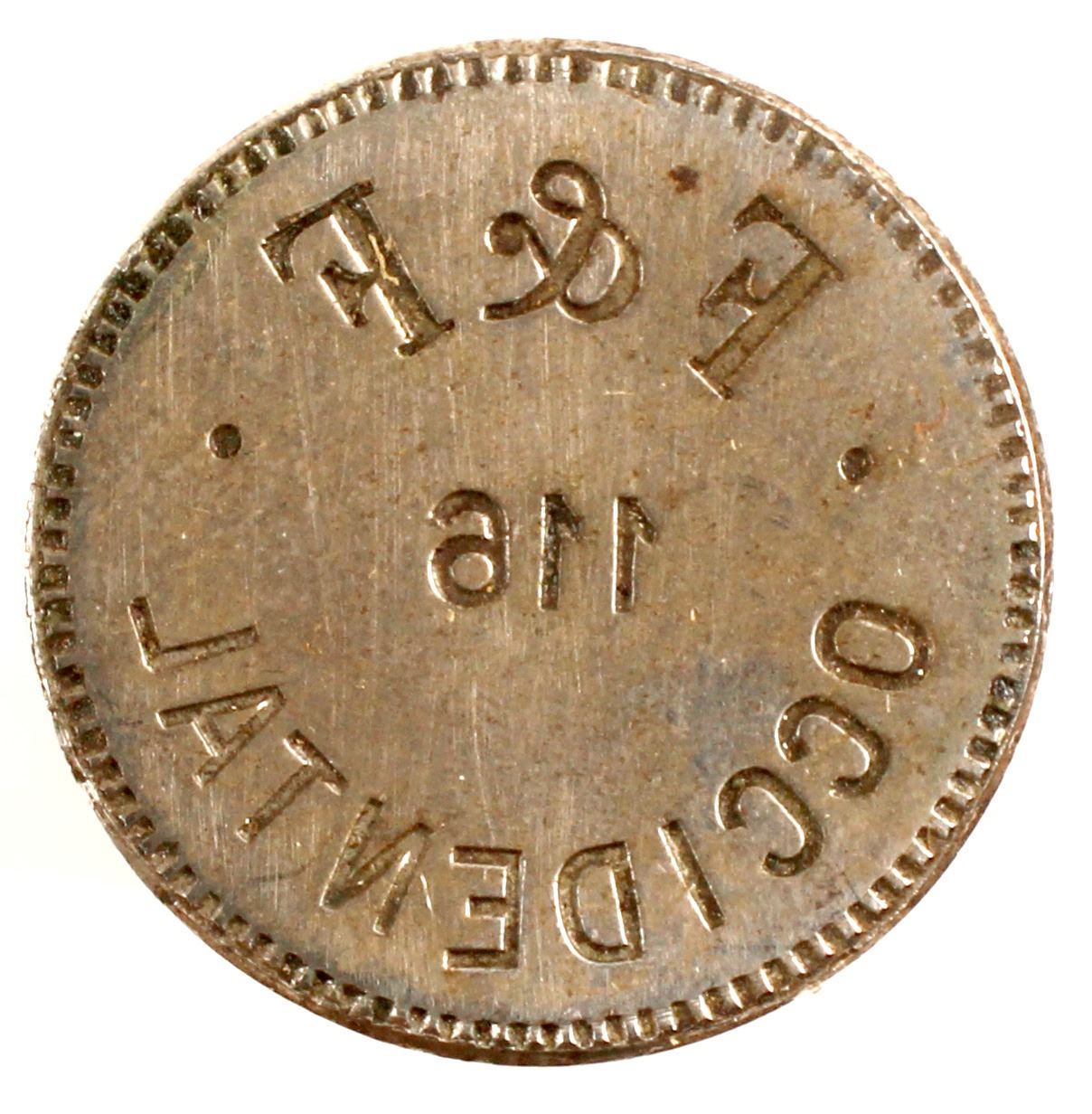 1 token die self identified from Occidental, WA. 21mm: F & E. Northwest Territorial Mint Historical Die Collection