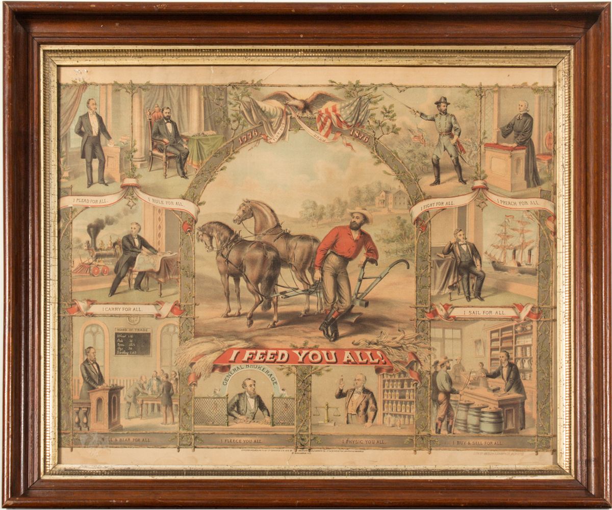A rare hand-colored lithograph (likely by artist Louis Kurz) printed by American Oleograph Co. This centennial broadside depicts various occupations with charming statements (framed—21.75" H x 25.75" W).