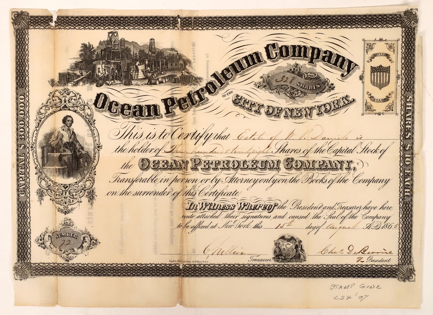 Issued 1865 Ocean Petroleum stock, oil derrick and blacksmith vignettes. Imprinted revenue stamp. 2 taped vertical tears, rough edges, please inspect. New York