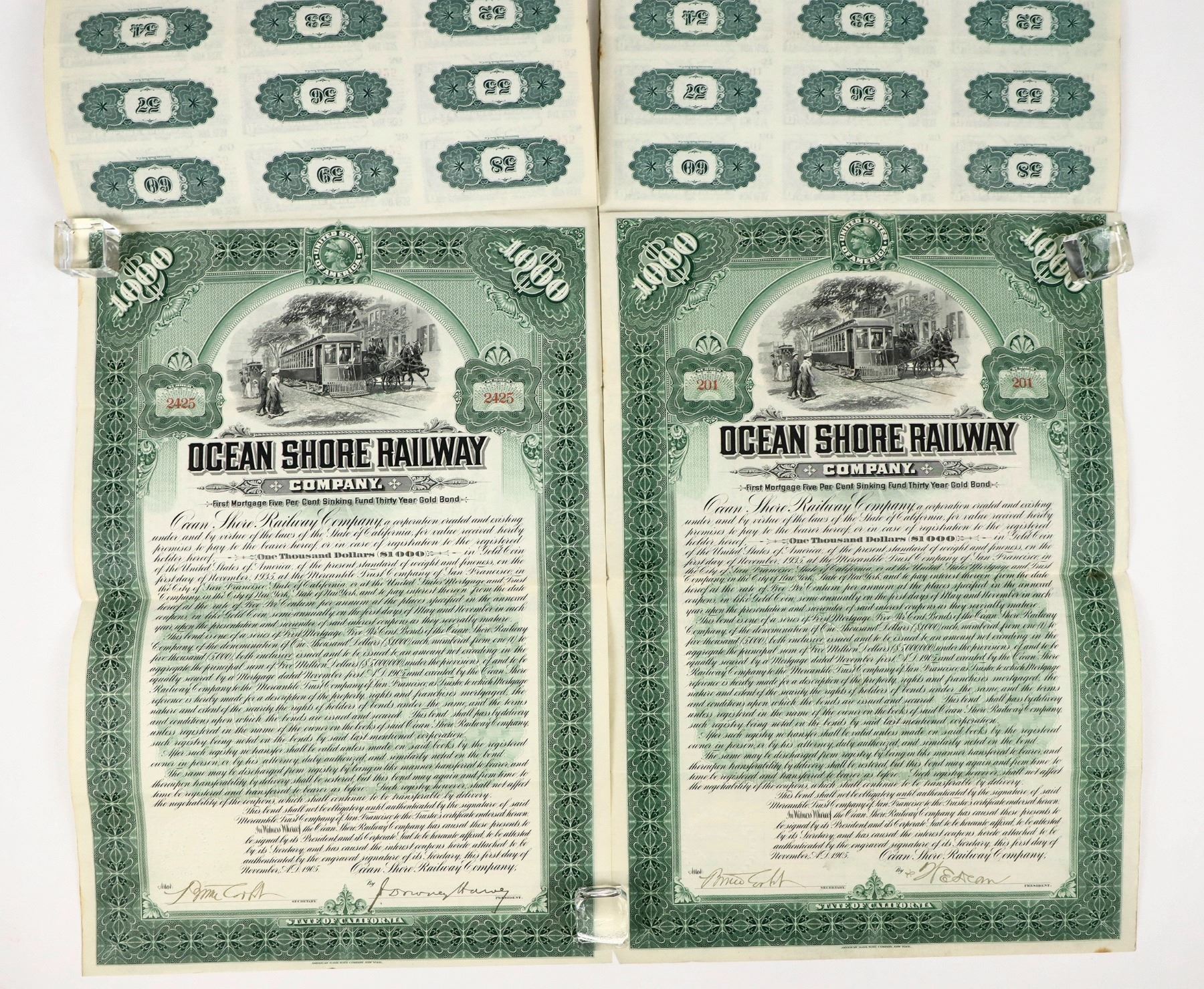 Lot of (2). This pair was issued by the Ocean Shore Railway Company, $1000 First Mortgage Five Per Cent Sinking Fund Thirty Year Gold Bond note. Great Trolley vignette top center, intricate borders surrounding the half-fold sheet. (2) bound sheets of (60) attached $25 coupons, only one third of the first sheet redeemed. Overall good condition, please see photos.