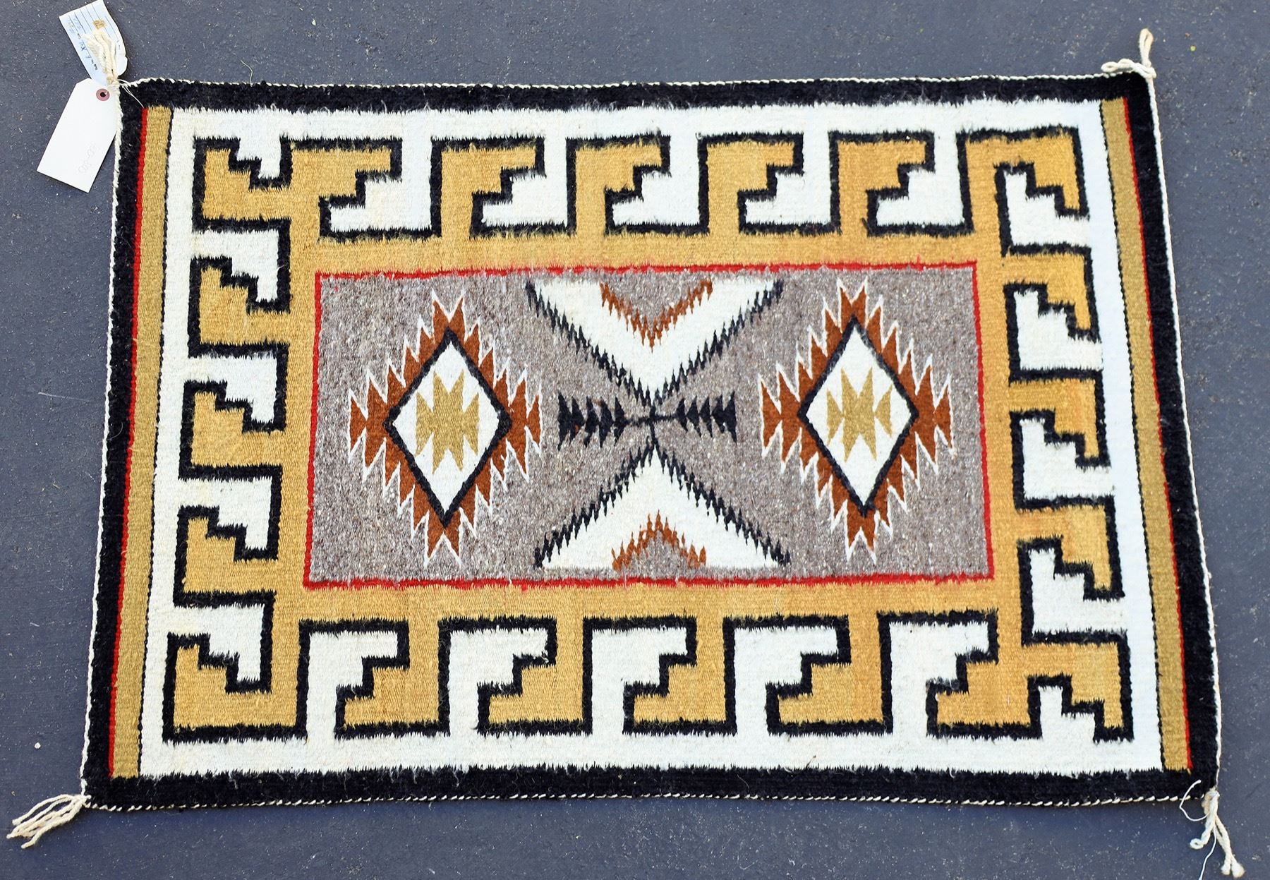 Navajo minimal design wool rug in ochre, brown, grey, black, and white. Probably Two Grey Hills. Original sales tag from Bob French Navajo Rugs in Waterflow, NM. Minni Bletso, weaver. 31" x 46". Very good condition.
