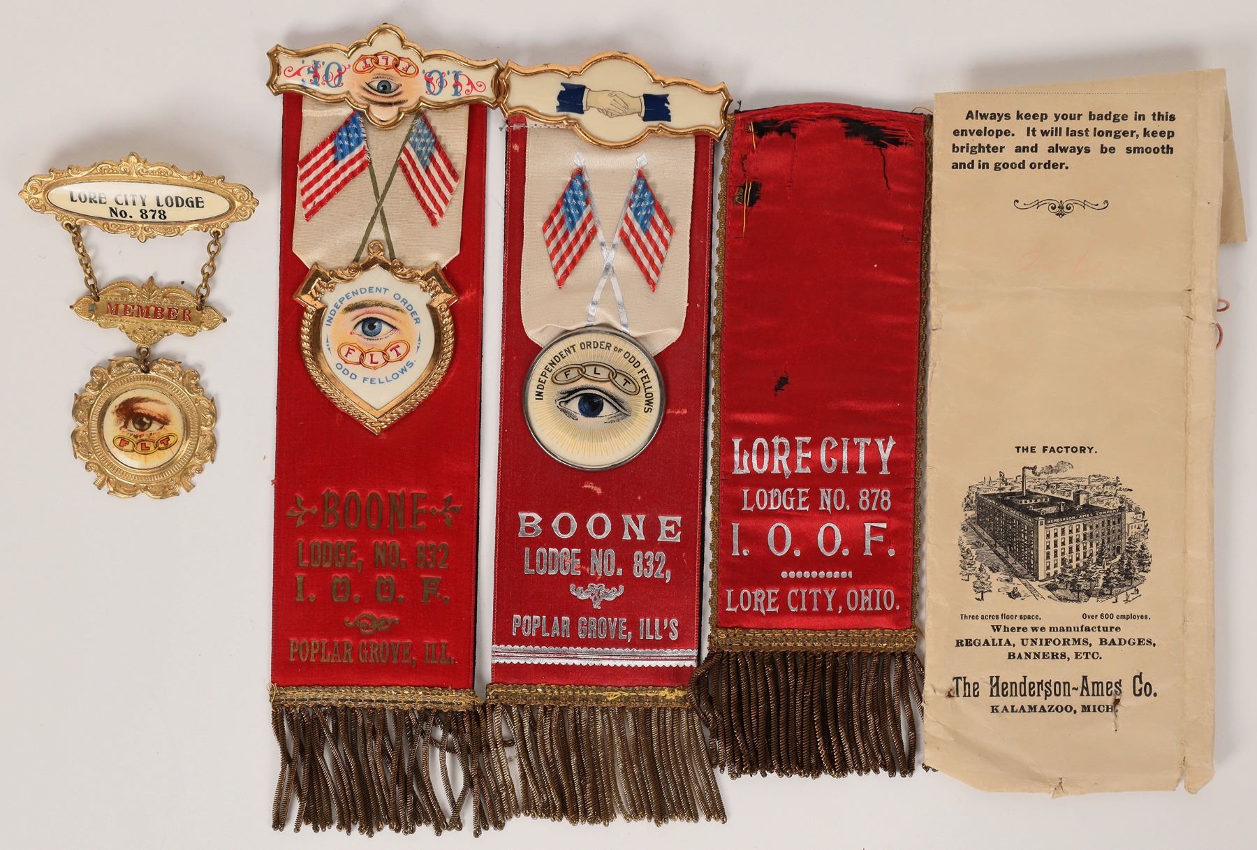 Fraternity badges from Odd Fellows (4). Included are Lodge 832 Illinois (2) and Lore City, Ohio (2). All in nice condition. Please see photos for more details. 1800s-1900s