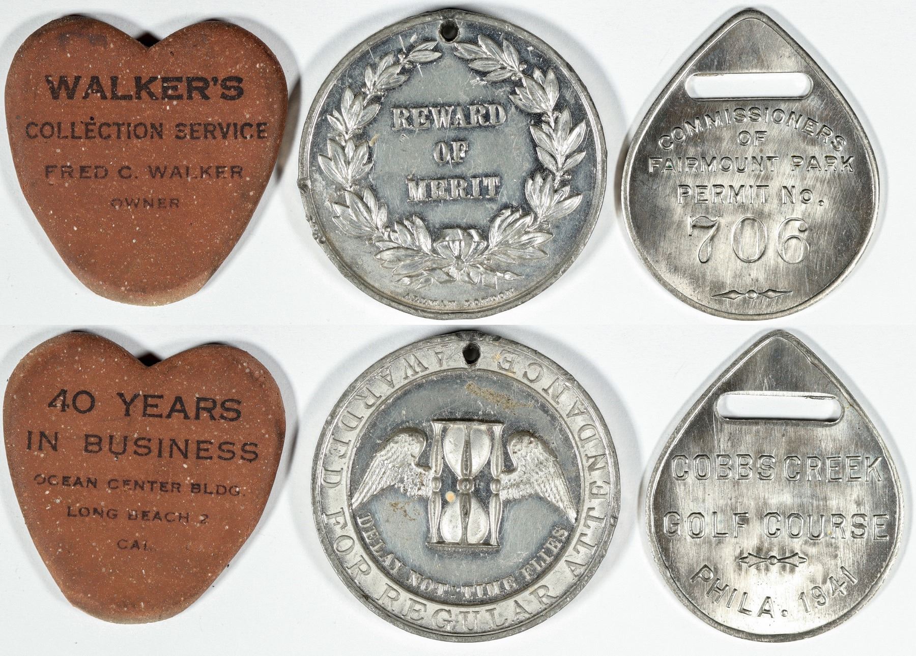 Three medals: 1) Cobbs Creek / Golf Course / Phila. 1941 // Commissioners / of / Fairmount Park / Permit No. / 706; white metal, pear shaped with slit for hanging. 2) 40 Years / In Business / Ocean Center Bldg. / Long Beach / Cal. // Walker's / Collection Service / Fred C. Walker / Owner; heart shaped, vulcanite? 3) Award For Regular Attendance / Delay Not Time Flies // Reward / Of / Merit / Allman London. white metal, round, holed, 42 mm.