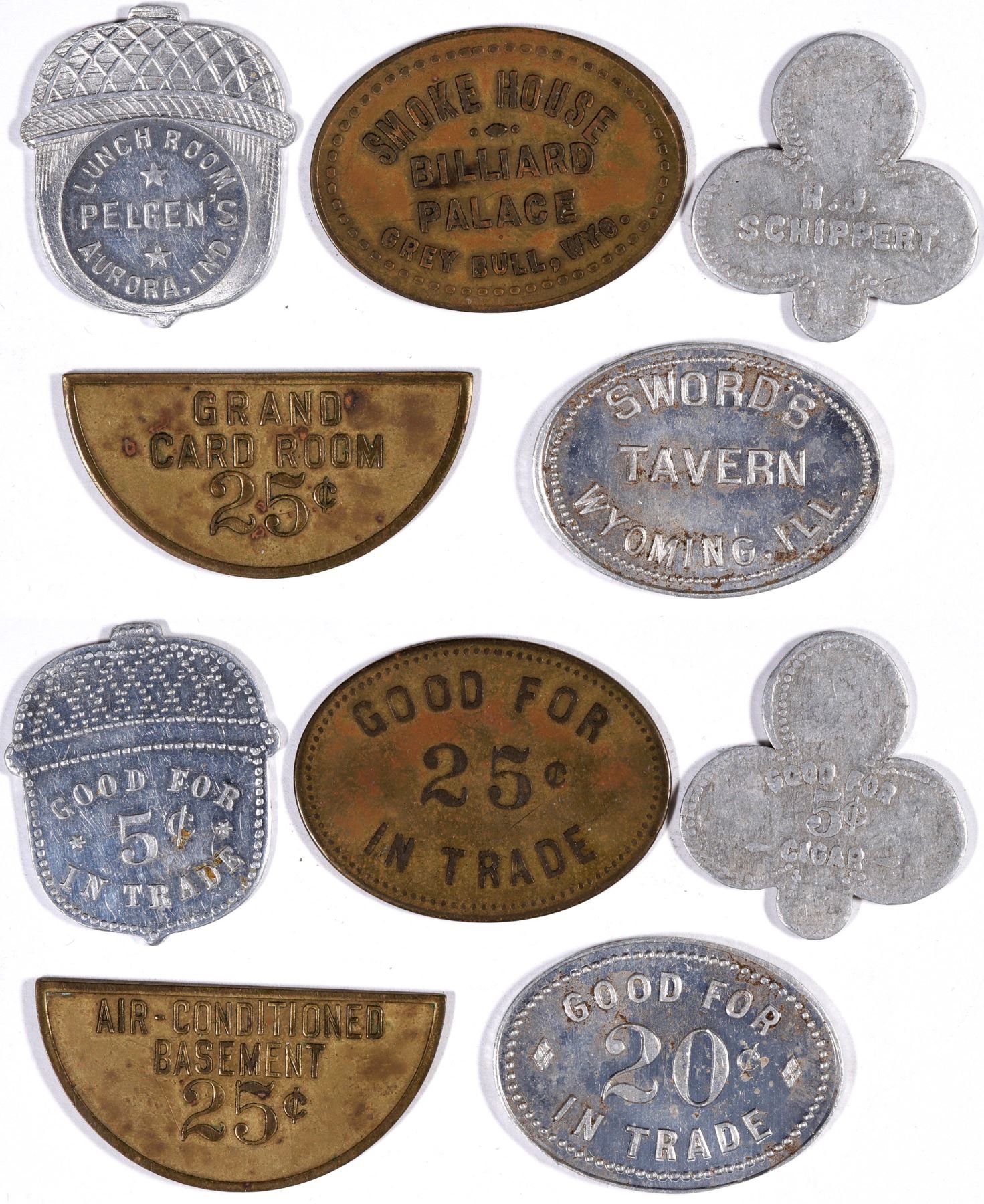 Lot of five tokens and none of them are round. 1) Sword's / Tavern / Wyoming, Ill. // Good For / 20c / In Trade; Al., oval, 32 x 24 mm. 2) H. J. / Schippert // Good For / 5c / Cigar; Al, cloverleaf, 26 mm. (attributed to Burlington, Iowa); 3) Grand / Card Room / 25c // Air Conditioned / Basement / 25c; Br., half a circle, 37 mm. (attributed to Fargo North Dakota. 4) Smoke House / Billiard / Palace / Grey Bull, Wyo. // Good For / 25c / In Trade; Br., oval, 35 x 27 mm. 5) Lunch Room / Pelgen's / Aurora, Ind. // Good For / 5c / In Trade; Al., acorn shaped, 29 mm.