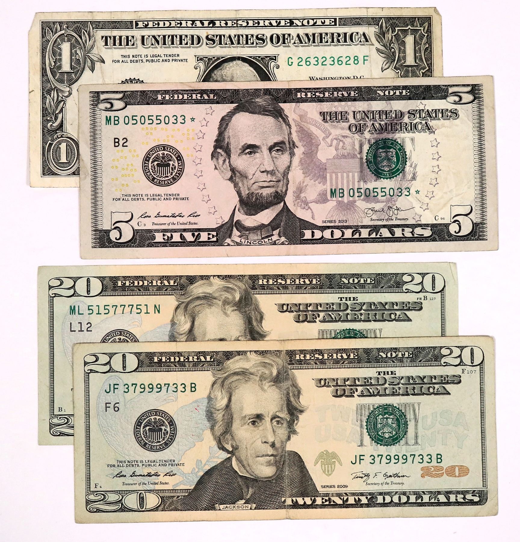 $46 face value U. S. currency with unique serial numbers. Nearly radar notes, and a "trinary" note with only three numbers used. one $1, one $5, two $20.