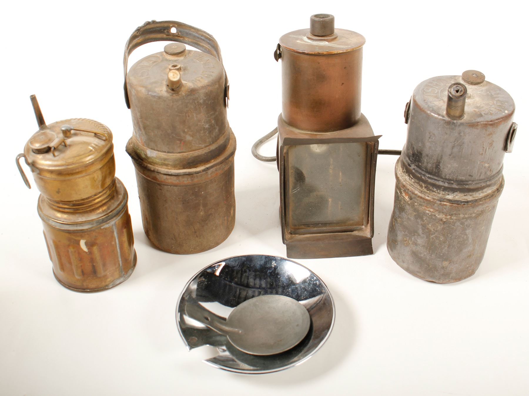 Odds and ends from the collection. Two FISMA carbides, one unmarked carbide and a third ancient lighting device probably for a buggy or a wagon as well as two reflectors. State: City: HWAC#: 47263 Date: