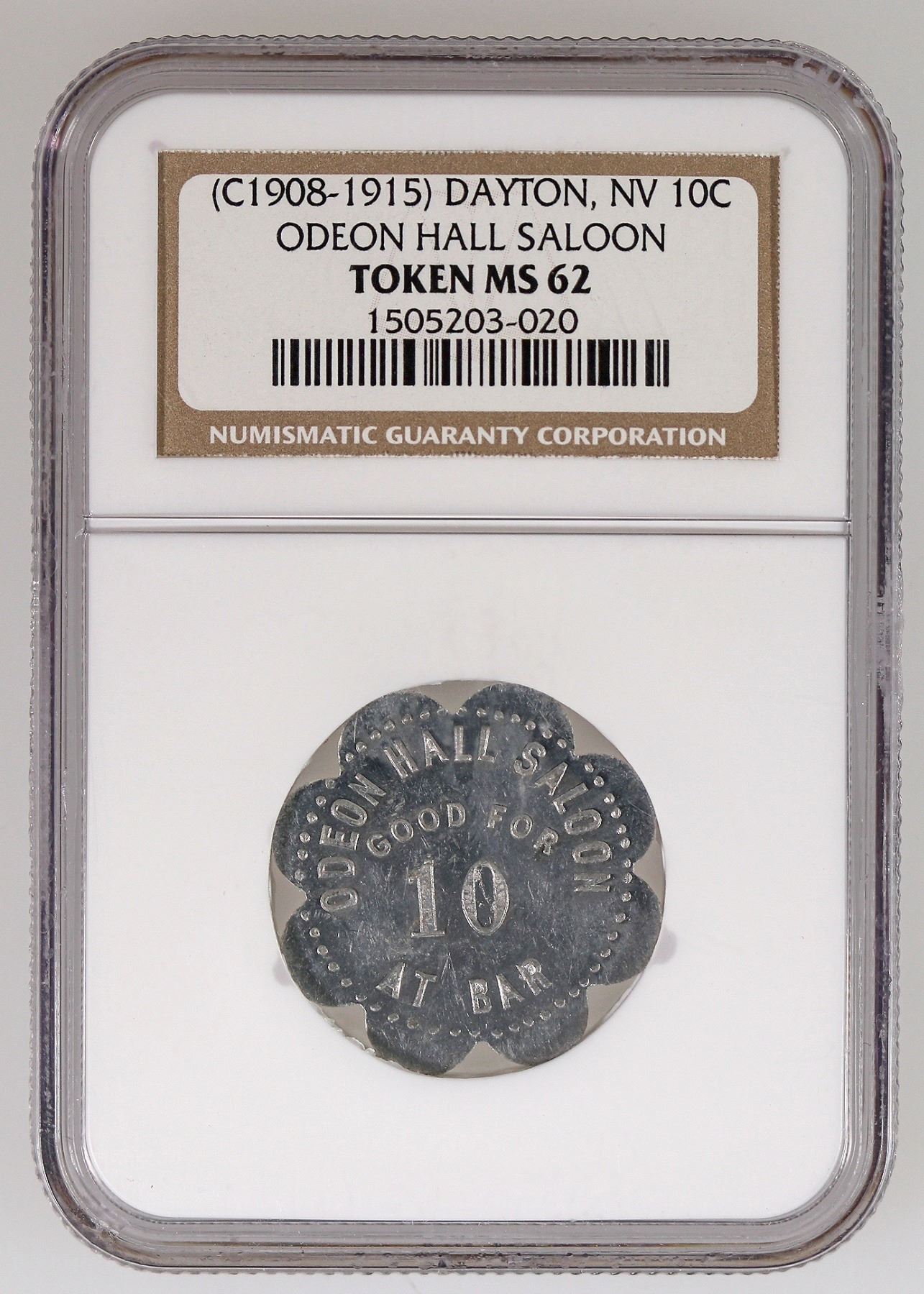 Rare variety. NGC certified MS 62! Circa 1908-1915, the Odeon Hall Saloon building, built in the 1860s, still stands today. ODEON HALL SALOON / GOOD FOR / 10 / AT BAR // (blank) ; Al, Sc 8, 28 mm.