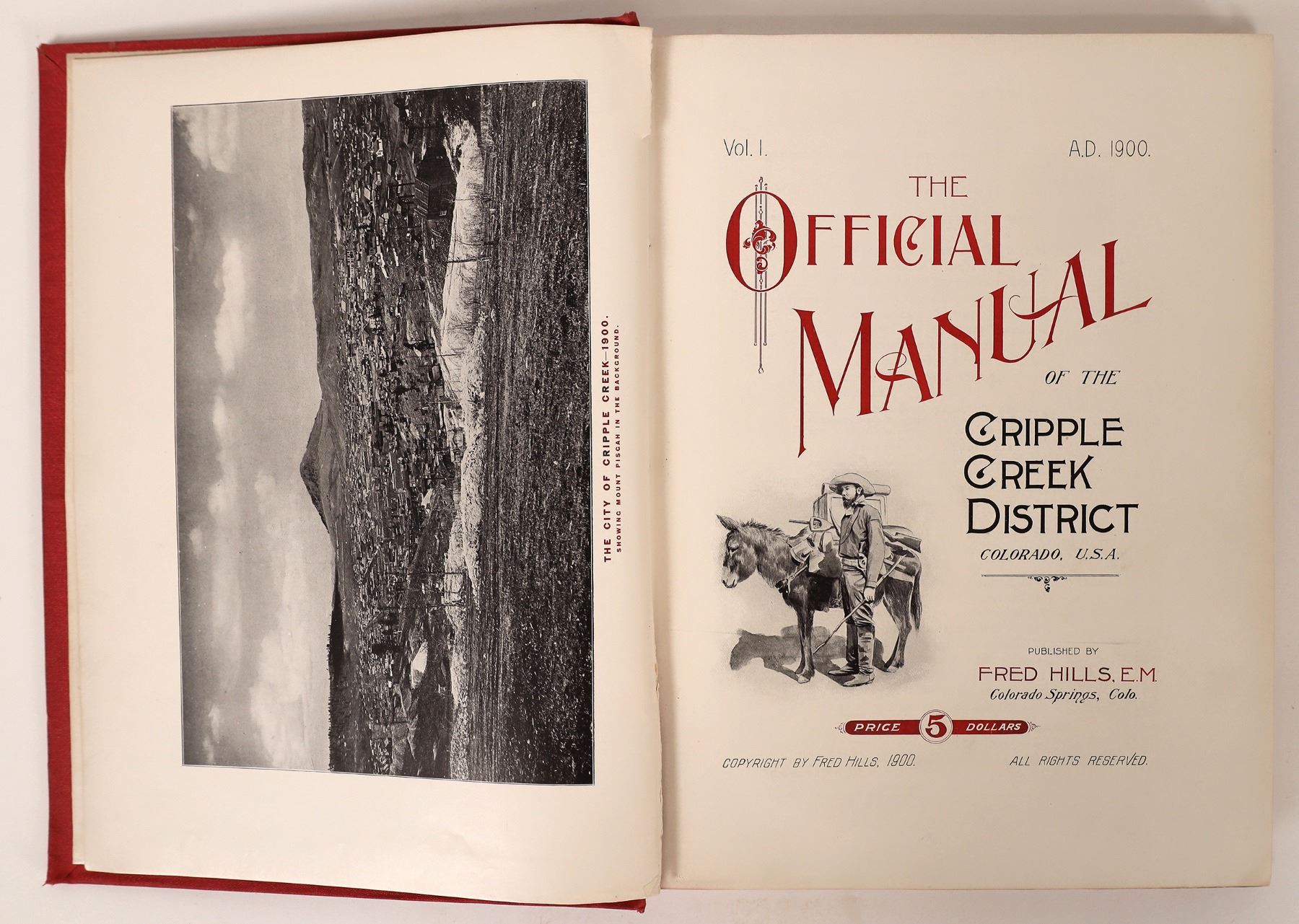 Official Manual of the Cripple Creek District, Colorado with Rare Map. Hills, Fred Compiler & Publisher, Colorado Springs, 1900. 495pp. 9 full-page photographic plates, hundreds of plates of mines, single-page map. Index to companies. Printed throughout in red and black. Original red cloth, gilt title on spine and front cover. Front cover with a few spots, corners with very slight wear, front and rear inner hinges cracked, small stain to fore-edge of last eleven leaves. With the exceptions noted, internally fine. Map is included.