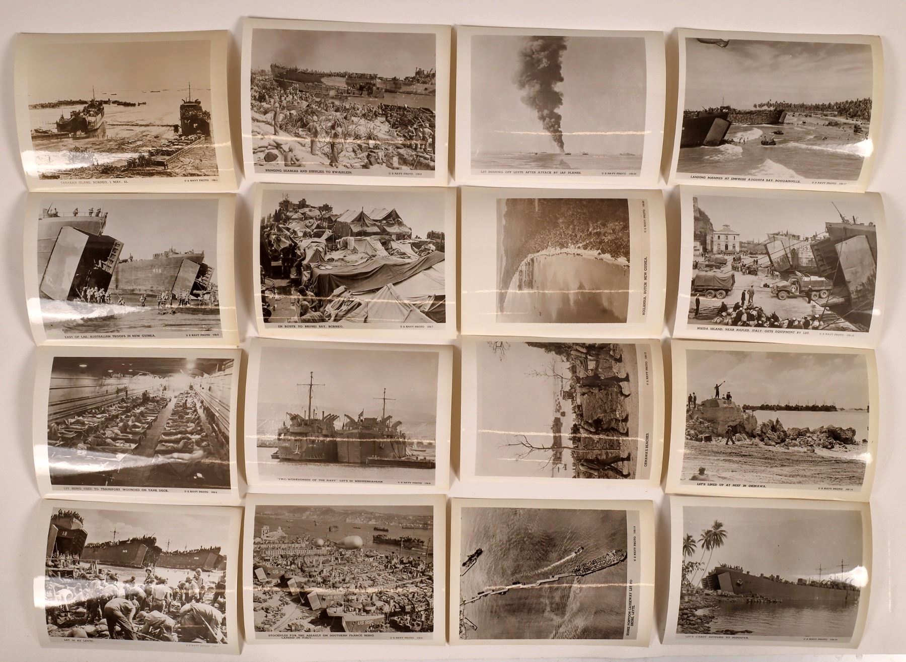 Official US Marines Women's Reserve Activities Set no. 24 with 20 photos including colors at Pearl Harbor, drilling at Camp Lejune, radio operator, packing parachutes, aviation control tower, repairing planes and more. Official US Navy set No. 128, L. S. T.'s in action. LST's in Borneo, Dutch New Guinea, Leytie, Italy, England readying For D Day, Rendova, Okinawa, Nisida, Bouganville, and more. Photos 5x4".