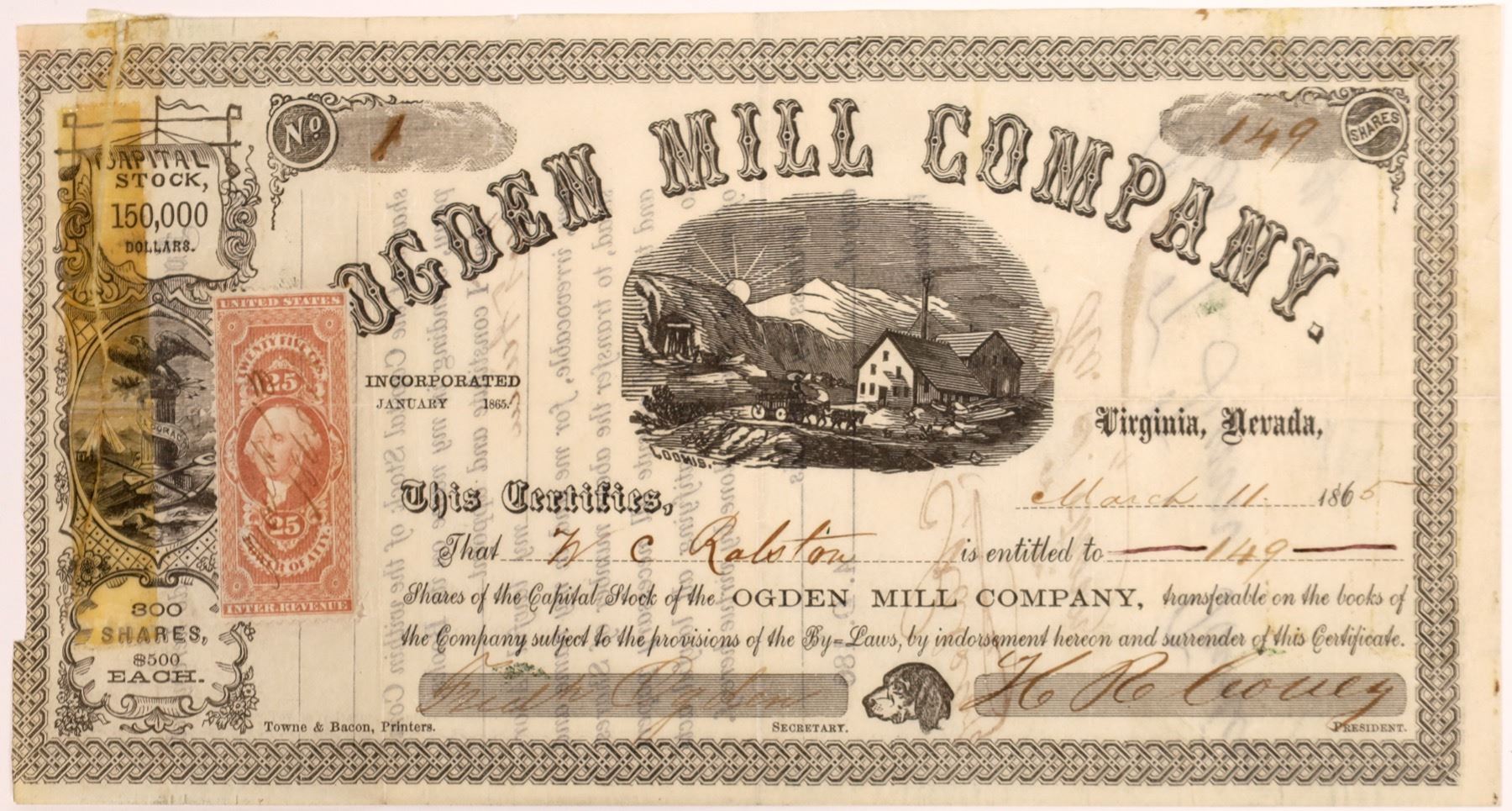 # 1 for 149 shares to W. C. Ralston. William Ralston endorses the certificate on the reverse. Dateline Virginia, March 16, 1865. Incorporated January 1865. Signed by secretary Fred Ogden (as in name of the company). On reverse is also a signature by George T. Finn who was an attorney to the bankers Statler & Arrington. Printed by Towne & Bacon. Brown 25c Power of Att'y revenue stamp. Three vignettes: 1) eagle on a column with the words 'El Dorado', 2) Loomis signed vignette of miners with tools and of an ore card. and 3) dog's head. Left side has a 3/4" tear and some aging. Another small tear to left of shares and left side cut unevenly. The Ogden & Milson Mill was in operation by November of 1860 in the Utah Territory [Kelly, 1st Nevada Directory]. In 1864 this mill was re-named and re-structured. It is an example how William Ralston, William Sharon and the Bank of California crowd controlled Comstock mining and made millionaires of themselves. Biography of Ralston and history of the mill included!