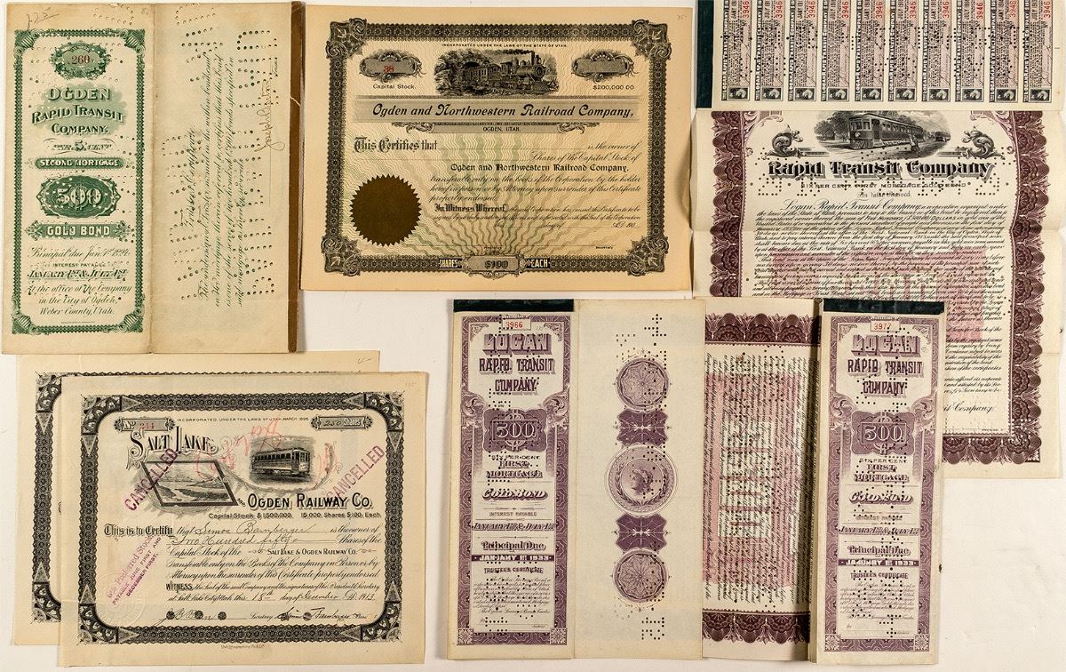 Lot of seven: three stocks and four bonds. 1) Stocks: Ogden & Northwestern Railroad Co. (unissued 190-, pictorial), and Salt Lake & Ogden Railway Co. (1913 cancelled plus unissued, pictorial). 2) Bonds: Three $500 bonds for the Logan Rapid Transit Company, 1913, all punch cancelled with streetcar vignette. Each has coupons. Also, a 1904 $500 bond issued by the Ogden Rapid Transit Company, punch cancelled, twenty coupons attached. (Prag Collection) City: Ogden State: Utah Date: 1904-1913 hwac# 34332