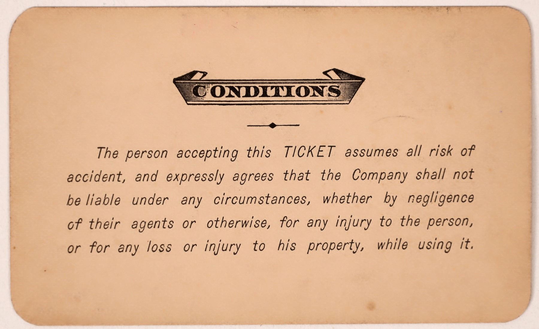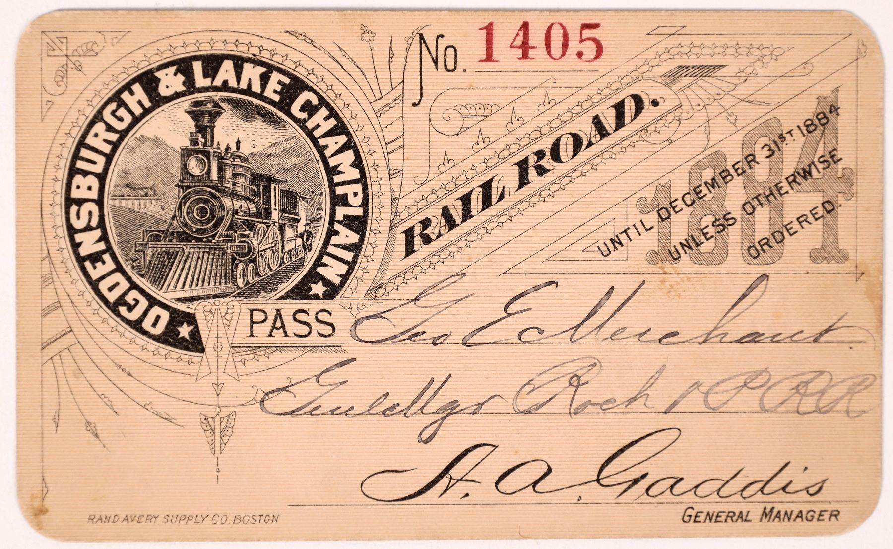 Name misspelled. Pass no. 1405, issued for the year 1884 to Geo. Merchant. Signed by general manager Gaddis. Black print on tan cardstock with nice locomotive vignette. Printed by Rand Avery Supply Co., Boston. Stains. The Ogdensburg and Lake Champlain Railroad was founded in 1849 as the Northern Railroad running from Ogdensburg to Rouses Point, New York. The 118-mile (190 km) railroad was leased by rival Central Vermont Railroad for several decades, ending in 1896. It was purchased in 1901 by the Rutland Railroad and became its Ogdensburg Division.